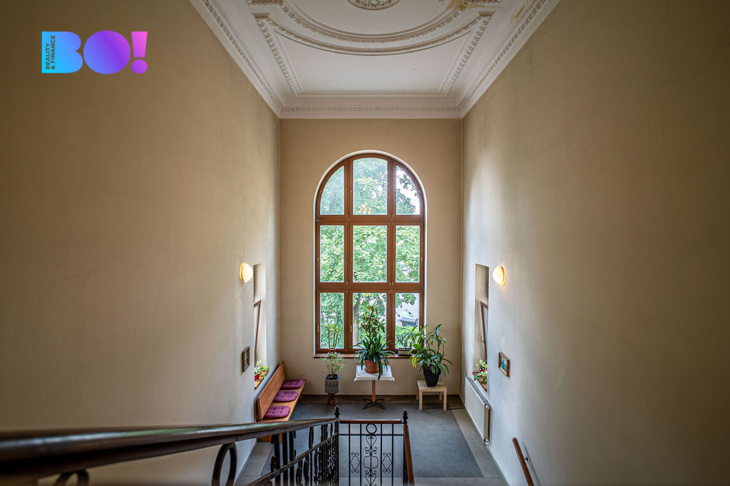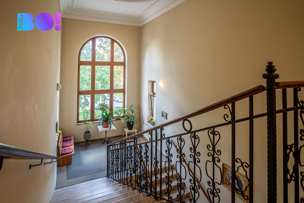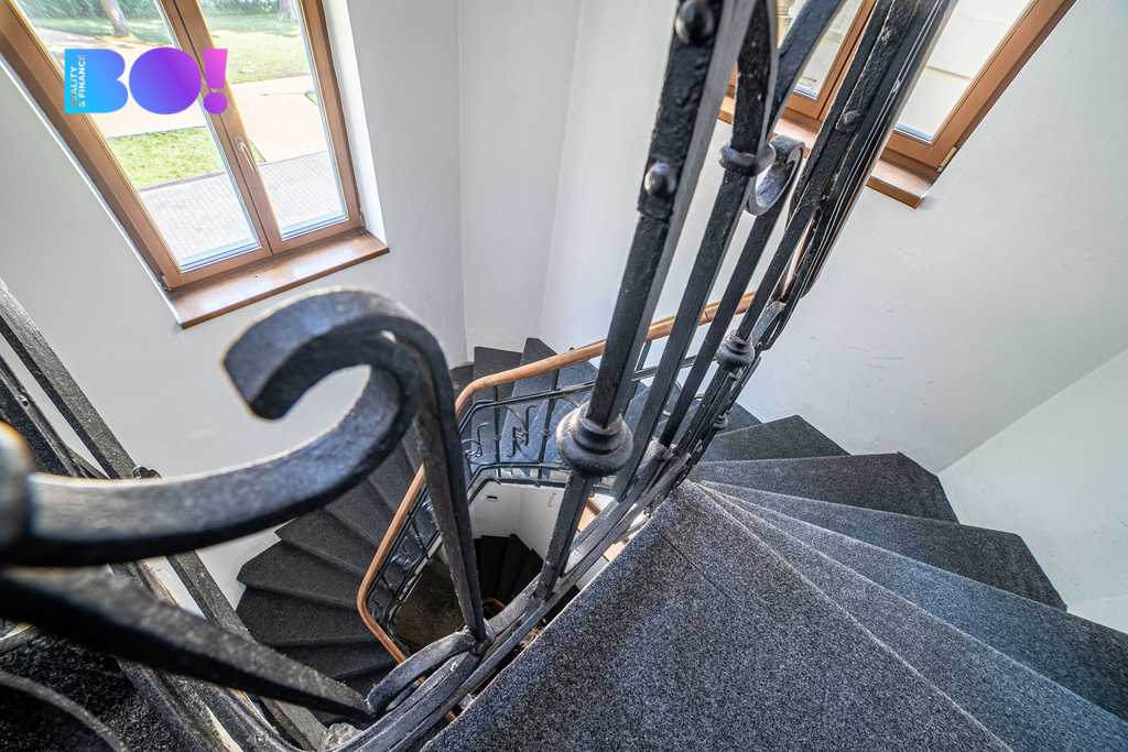 Hlavní schodiště vedoucí do 2. nadzemního podlaží je dalším architektonickým skvostem, který podtrhne ducha této nemovitosti.