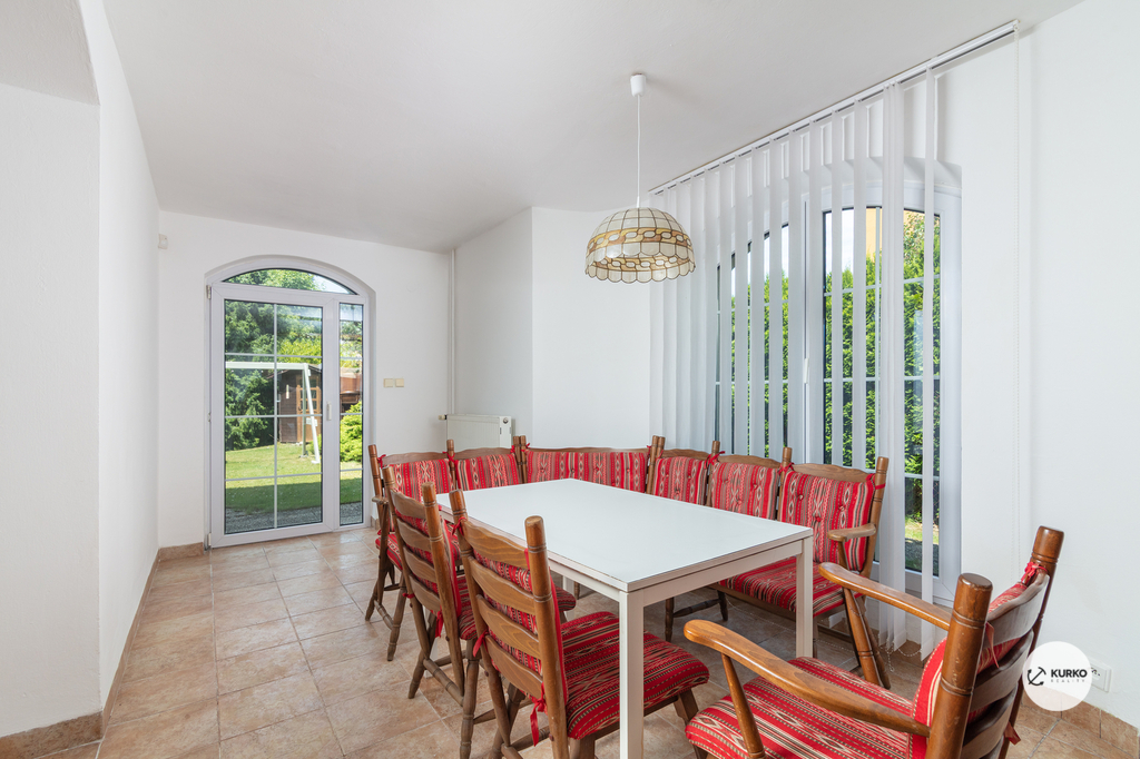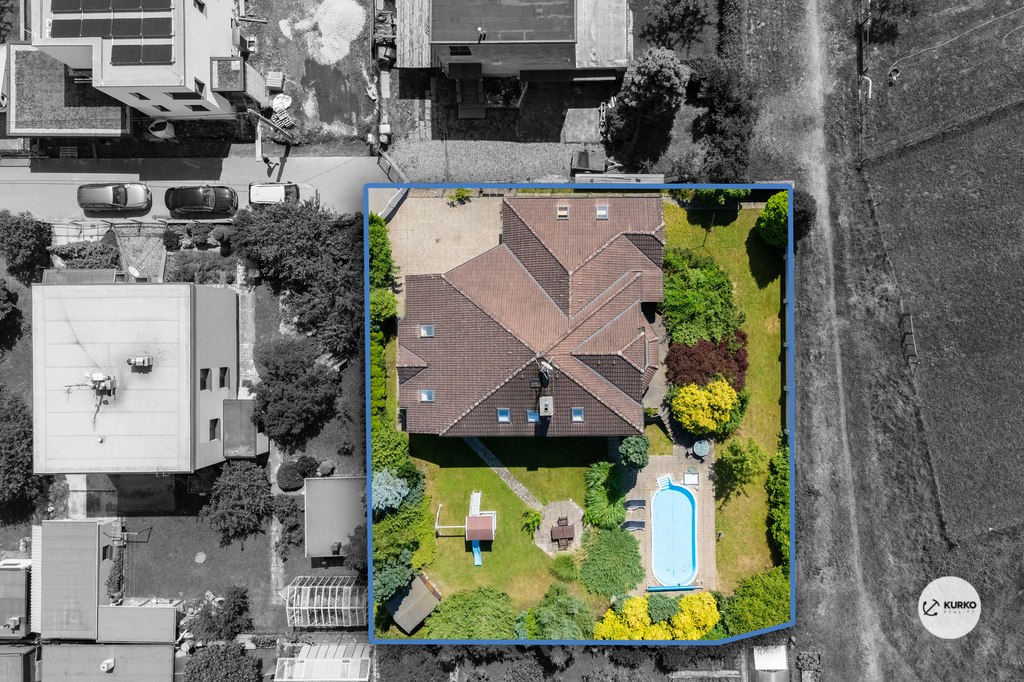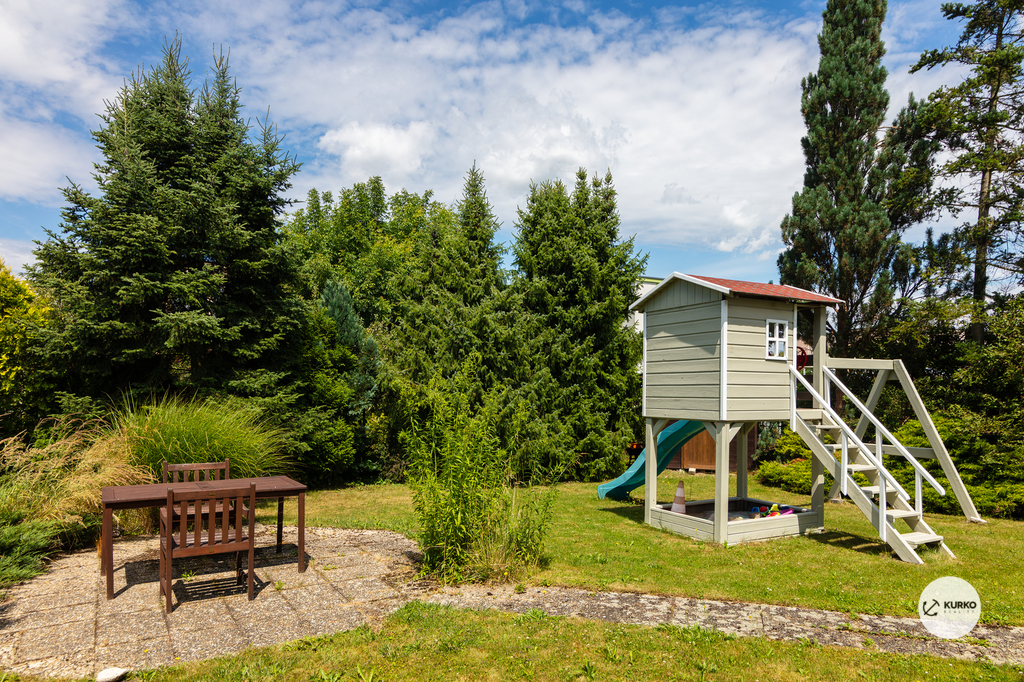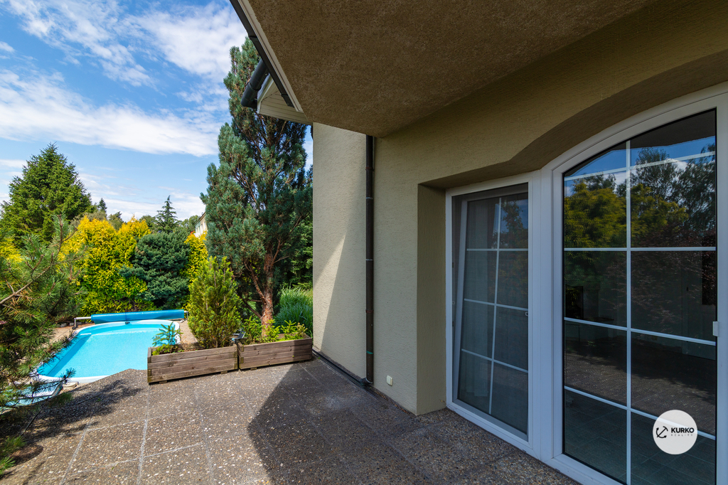 Na udržované zahradě se vzrostlými stromy, které zajišťují příjemné soukromí, se nachází prostorná terasa o výměře 23 m² a zapuštěný bazén o rozměrech 8,3 × 3,5 m, ideální pro letní relaxaci i rodinné aktivity.