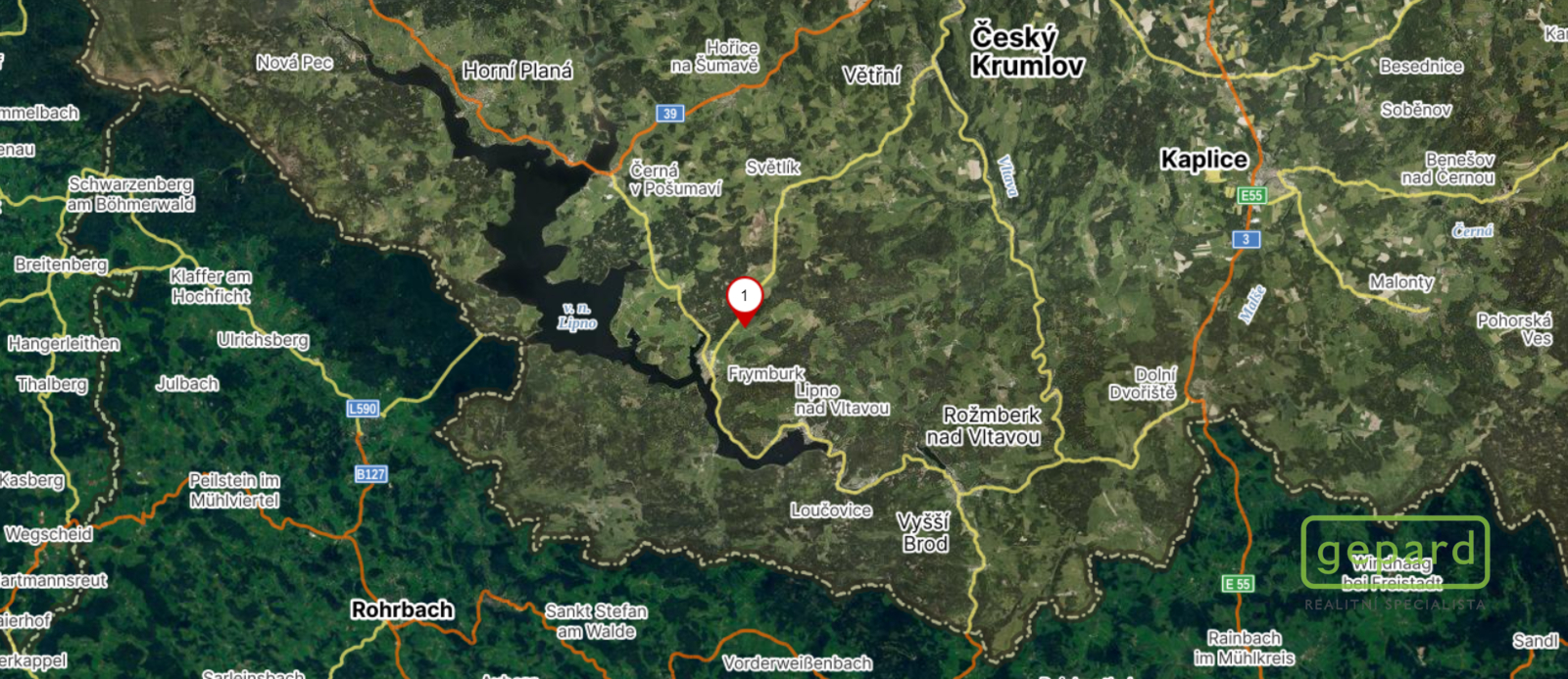 Okresní město Český Krumlov s historickým centrem UNESCO 24km.
