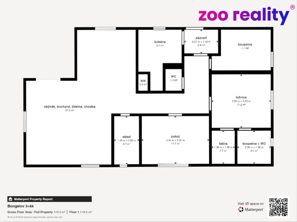 Dům s užitnou plochou 120 m² o dispozici 3+kk zahrnuje prostorný obývací pokoj propojený s jídelním koutem a kuchyní. Dále pak ložnici, která nabízí i komfort navazující koupelny a šatny. Následně pokoj, koupelnu, samostatné WC, praktickou spíž a technickou místnost. K dispozici je i půda jakožto úložný prostor.