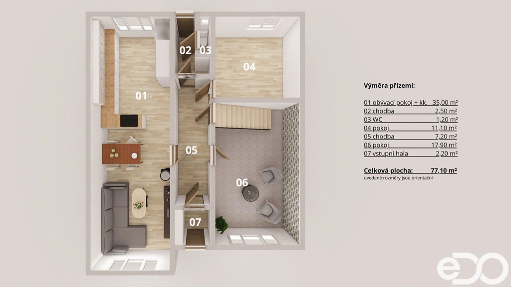 1. nadzemní podlaží: vstupní zádveří, obývací pokoj s kuchyňským koutem a krbovými kamny, dále místnost s napojením na schodiště – vhodná jako pracovna, pokoj pro hosty nebo po úpravě jako samostatný pokoj, samostatné WC, a technická místnost / prádelna, kterou lze přestavět na druhou koupelnu.