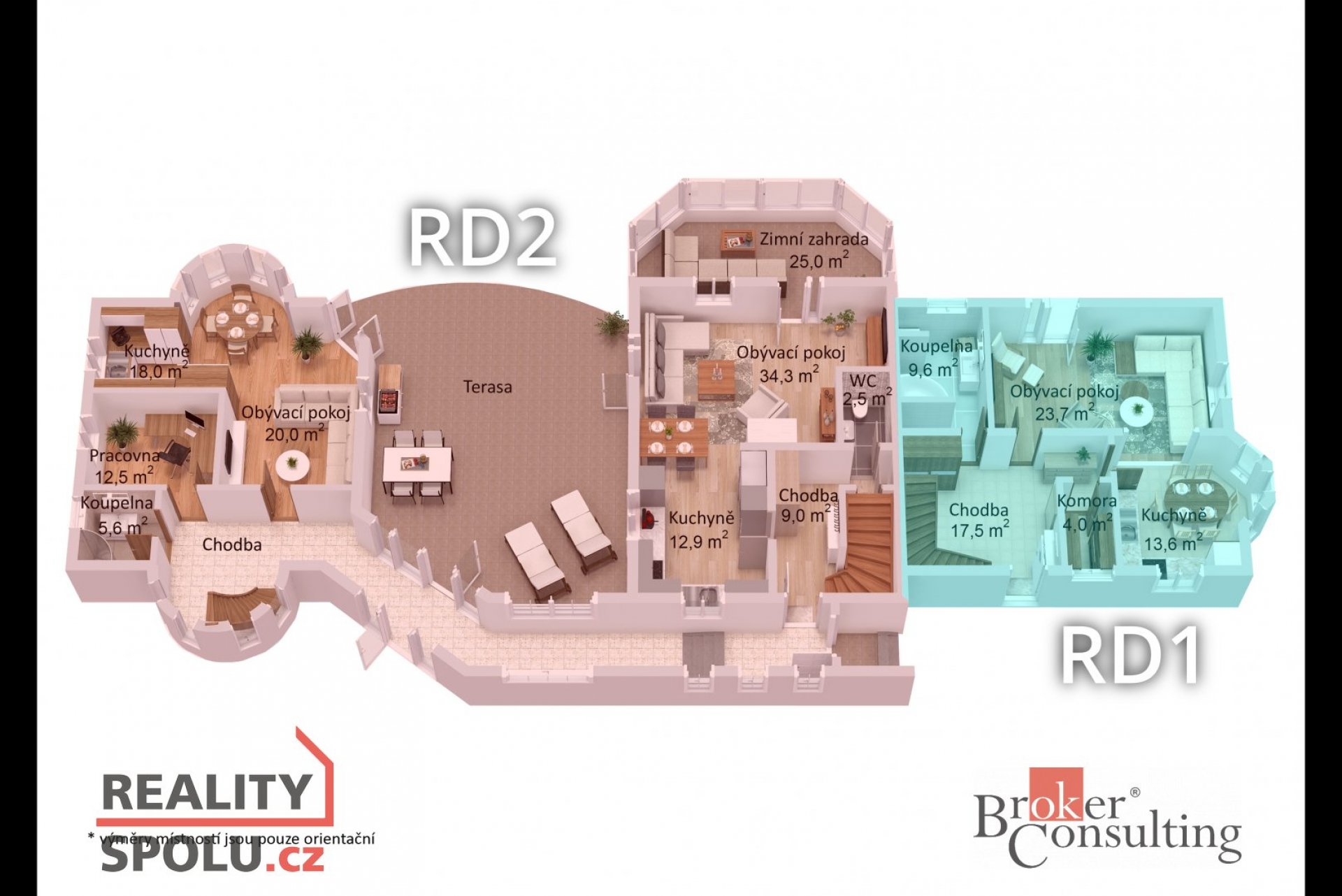 Krajová část domu:Navazující dům vystavený v roce 2010 je propojený vstupní chodbou s RD 2 disponuje vstupní halou, dále obývací pokoj s dřevěnou podlahou, vedlejší pokoj má přívod vody a odpadu na případné vybudování kuchyně. V této místností je i vedený komín pro případné napojení na krbová kamna. Koupelna se sprchou a toaletou. Spodní patro má podlahové vytápění. V patře je koupelna se sprchou a toaletou s podlahovým vytápěním. Další dva pokoje, který mají vstupy na společný balkón. Tento dům disponuje zastřešenou terasou se stahovacími žaluziemi. Zahrada je nádherně udržovaná se vzrostlými keři a dřevinami a má automatickou závlahu. Dvougenerační dům se nabízí za 8 mio. Kč.