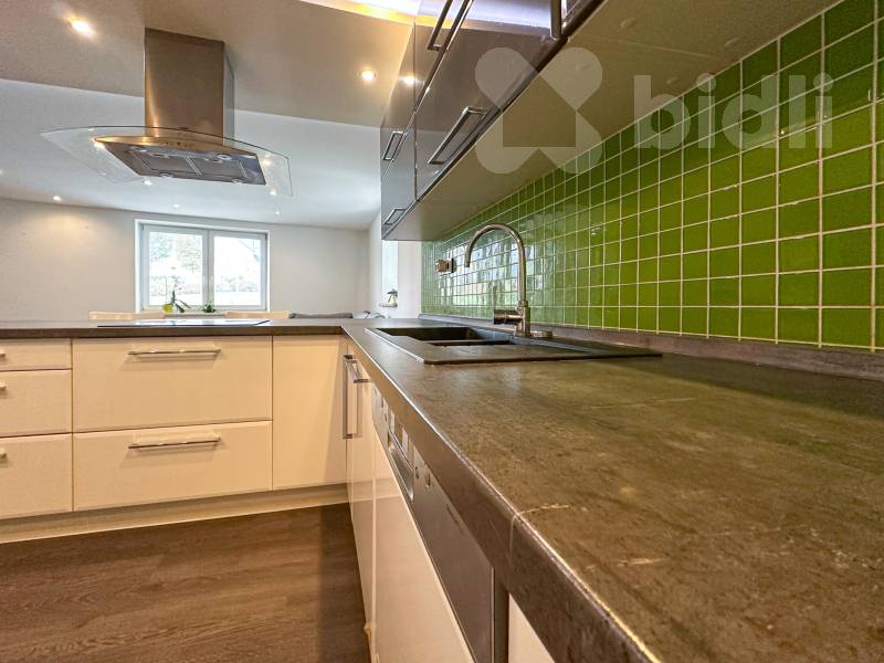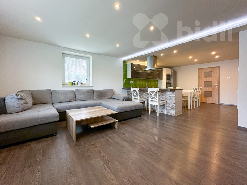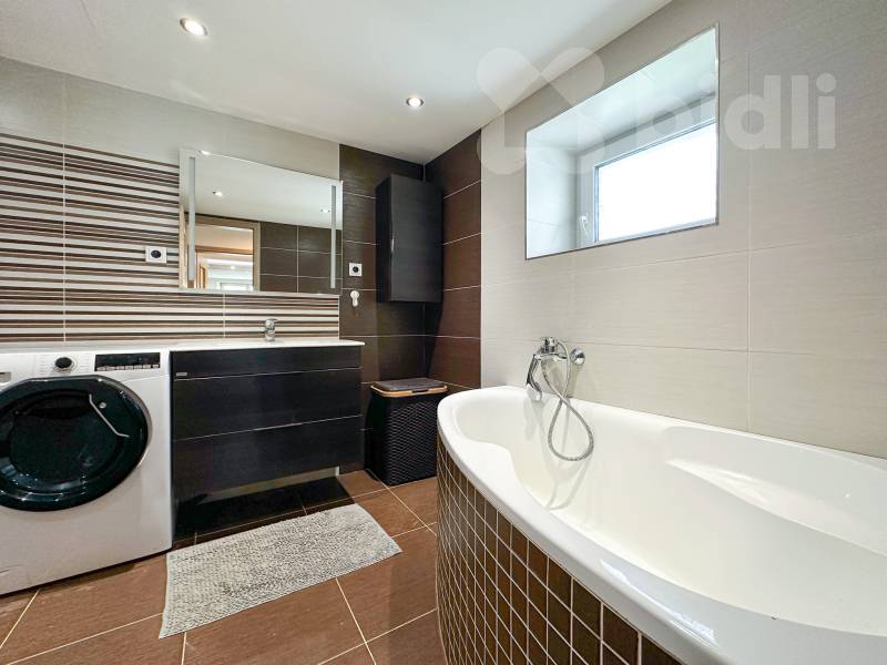 rodinná část 3+kk s velkým obývacím pokojem, prostornou kuchyní s jídelnou a originálním průhledem přes zabudované akvárium, koupelna s rohovou vanou a sprchovým koutem, samostatné WC, technická místnost, dva průchozí pokoje