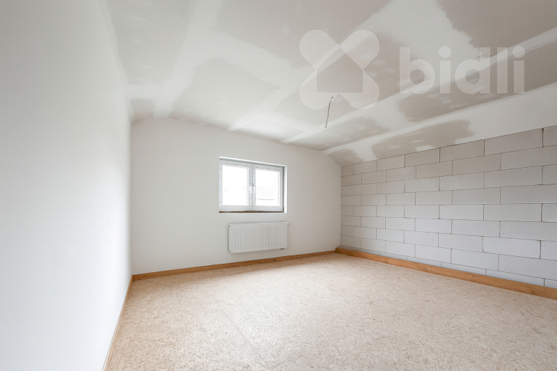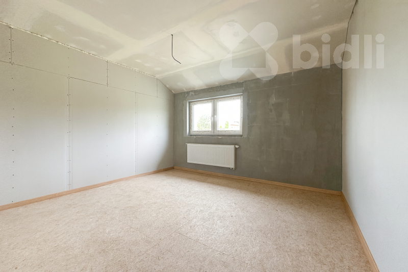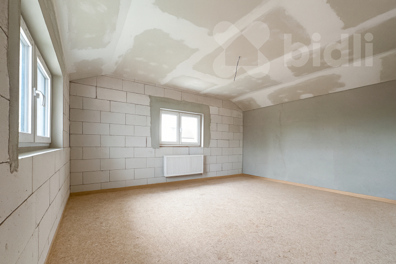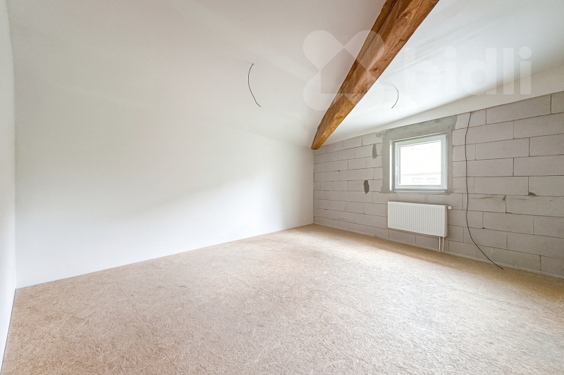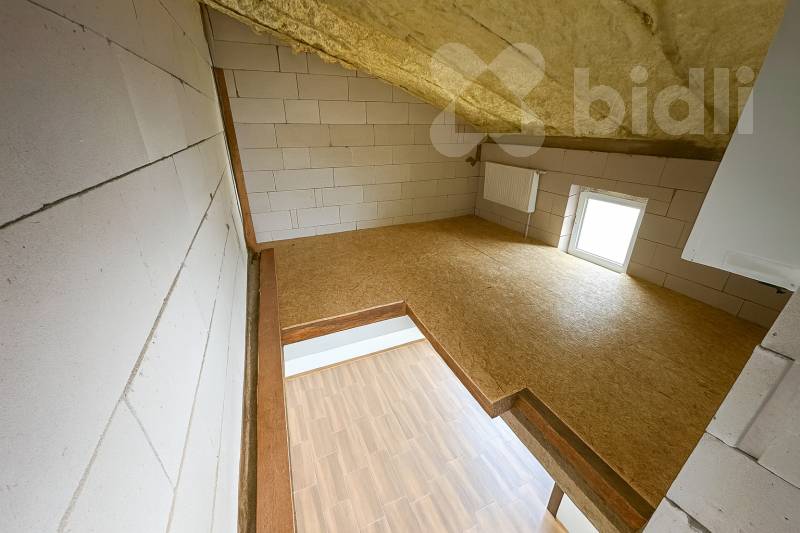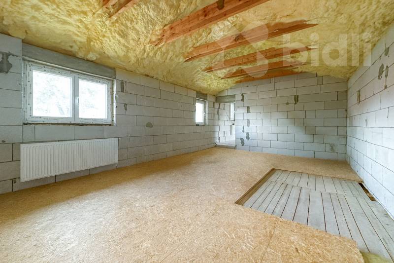 Patro - před dokončením; dispozici lze upravit podle přání kupujícího. Plánováno 3 pokoje, koupelna s WC a herna. Možnost dohody s majitelem na kompletním dokončení.
