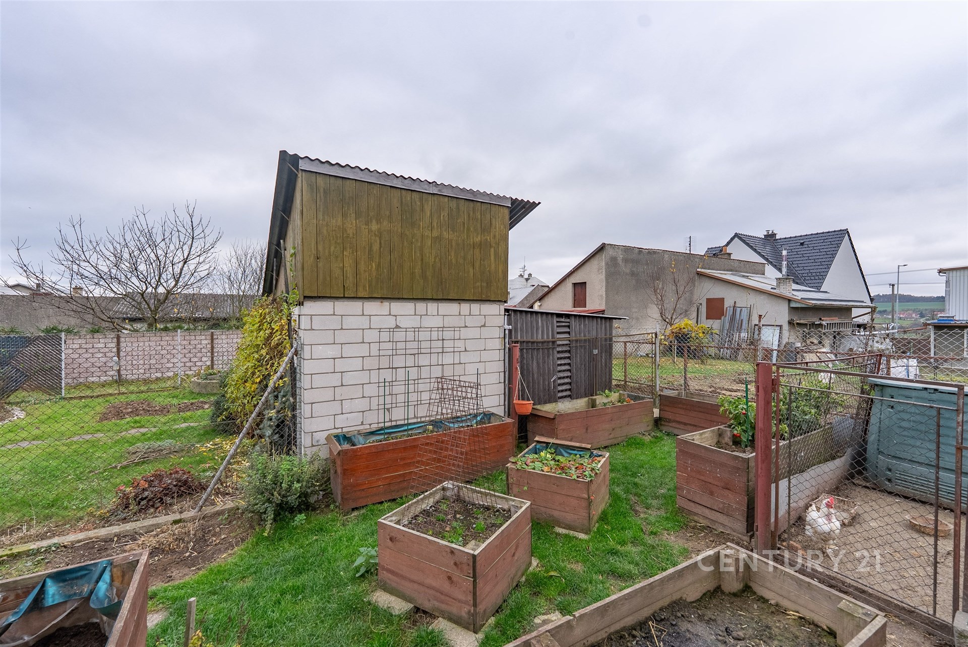 Z přízemí je možné skrze prosklené kuchyňské dveře vyjít na prostornou zahradu 210m2. Zde je k dispozici venkovní posezení s krbem a udírnou a zóna na hraní pro děti. Na konci pozemku se pak nachází zděná kůlna na zahradní nářadí a techniku a kurník pro slepice s výběhem.