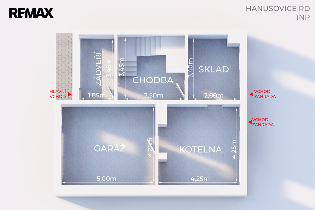 vstupní zádveří, hala s výtahem, prádelna, technická místnost a garáž