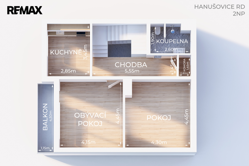 chodba, koupelna, komora, kuchyně, obývací pokoj se vstupem na balkon a ložnice