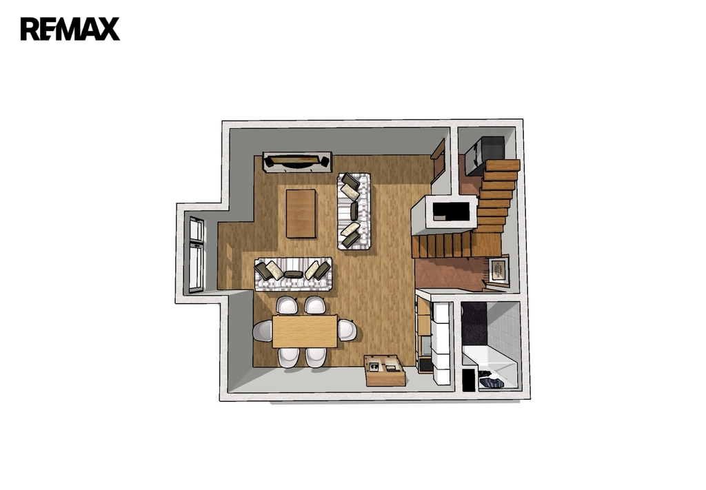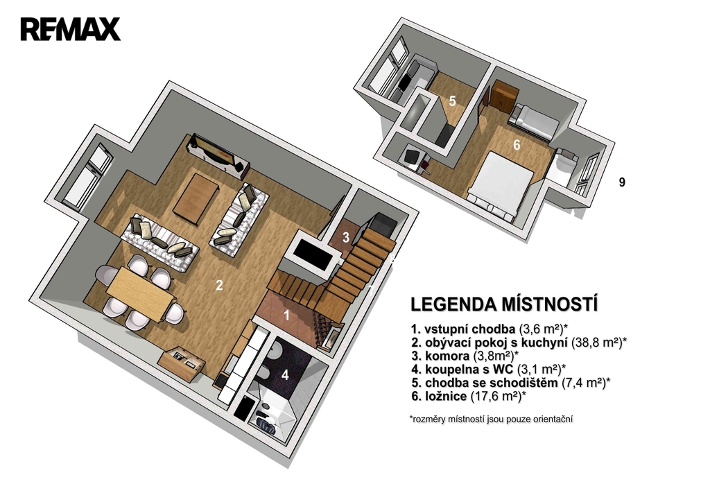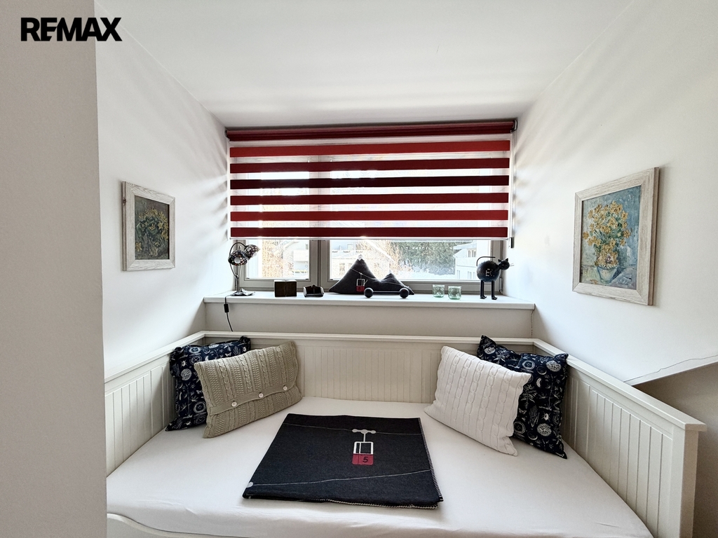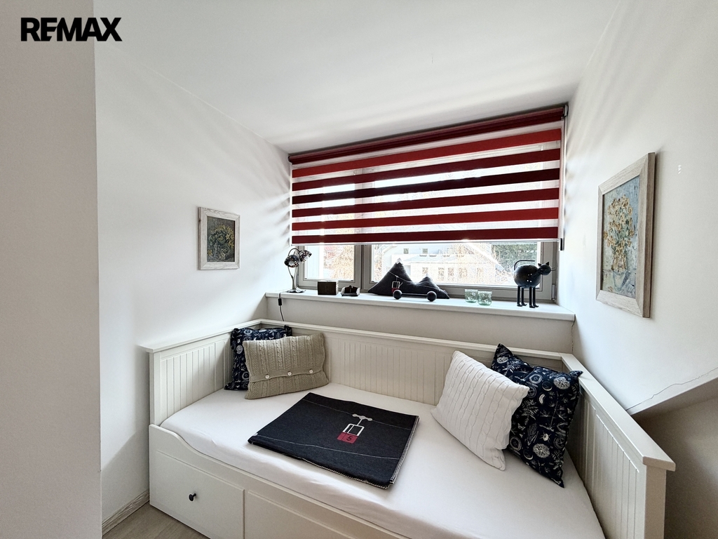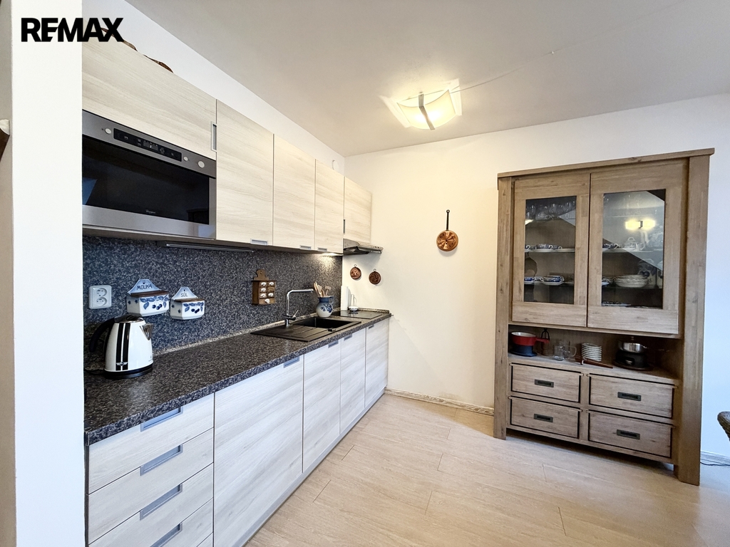 vstupní chodbička s úložným prostorem, koupelna s WC, světlý obývací pokoj s moderním kuchyňskou linkou a masivním jídelním stolem, odpočinková část obývacího pokoje s pohodlnou rozkládací sedačkou, malou komorou a komodami, mezonetové, vzdušné řešení prostoru - relaxační kout a prostorná ložnice.