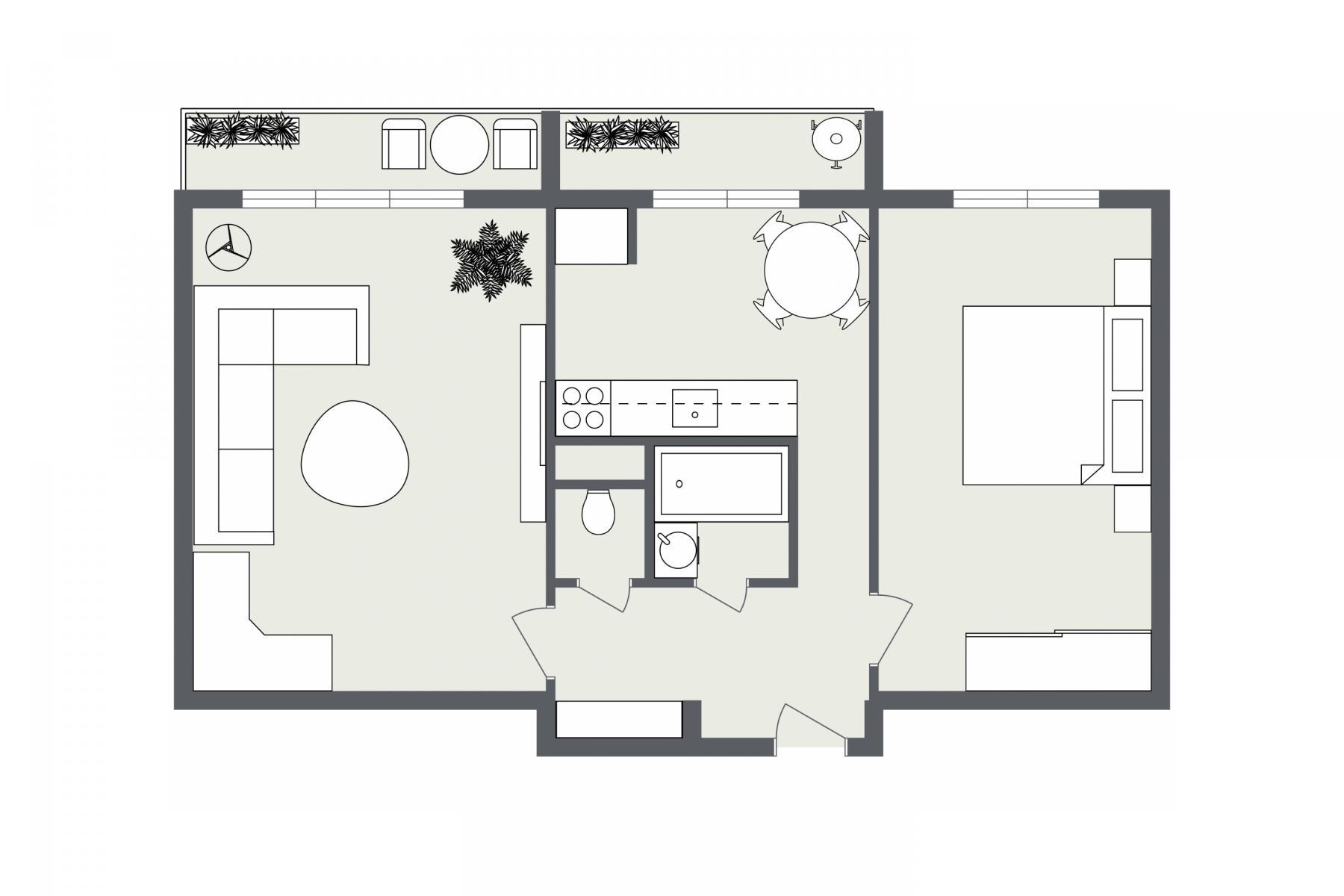 - nabízí se tady snadné propojení s obývacím pokojem. Tím, že jsou tady dva balkony, pak budeš mít jeden balkon z obýváku a druhý z kuchyně. Určitě je horší hádat bez balkonu, než o to, na který půjdeš trucovat,