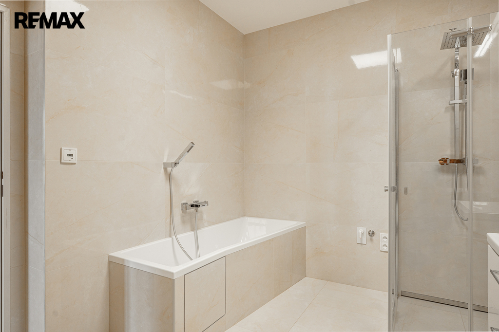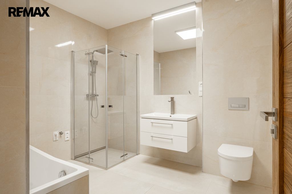 * kvalitní sanita (sprchový kout i vana) a přípojné místo pro pračku i sušičku