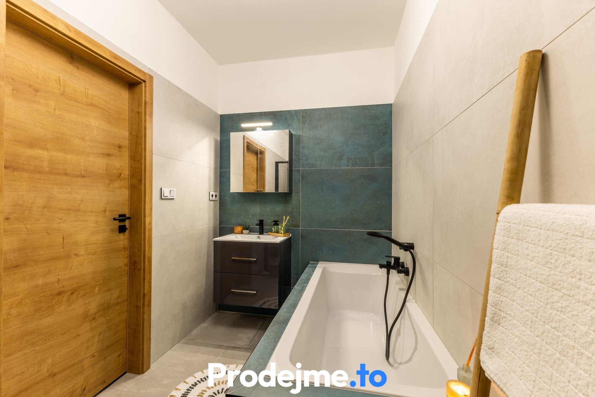 Elegantní koupelna s velkoformátovými obklady disponuje vanou i sprchovým koutem. Samozřejmostí je toaleta přímo v koupelně.