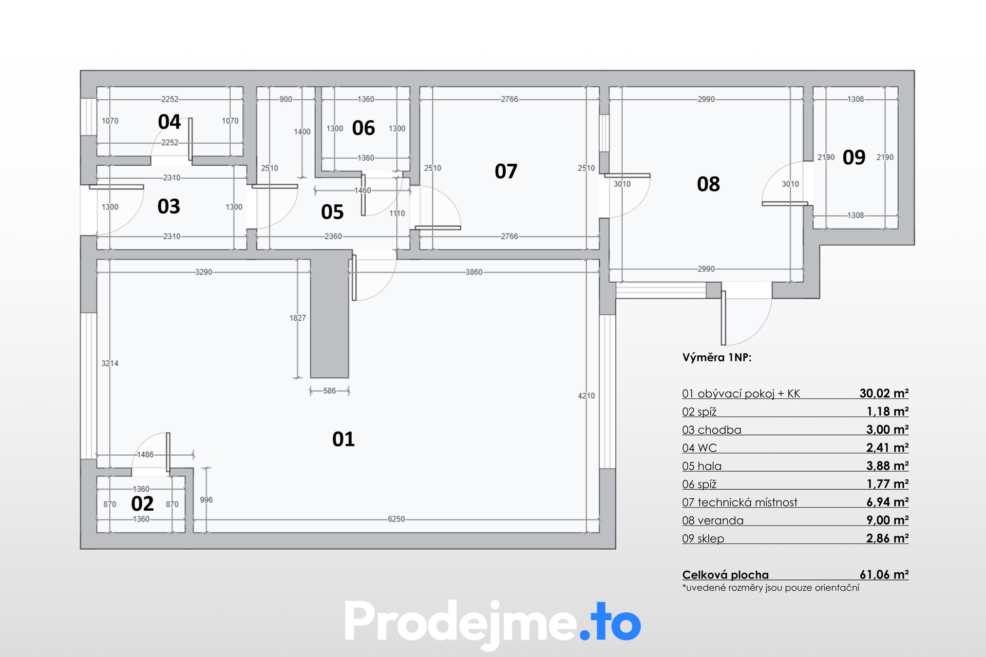 V přízemí o ploše 61 m2 se nachází hlavní obytná část – velký obývací pokoj s kuchyňským koutem, vstupní hala, chodba, samostatná toaleta, technická místnost, dvě praktické spíže (1,18 m2 a 1,8m2), veranda, sklep a další úložný prostor pod schodištěm.