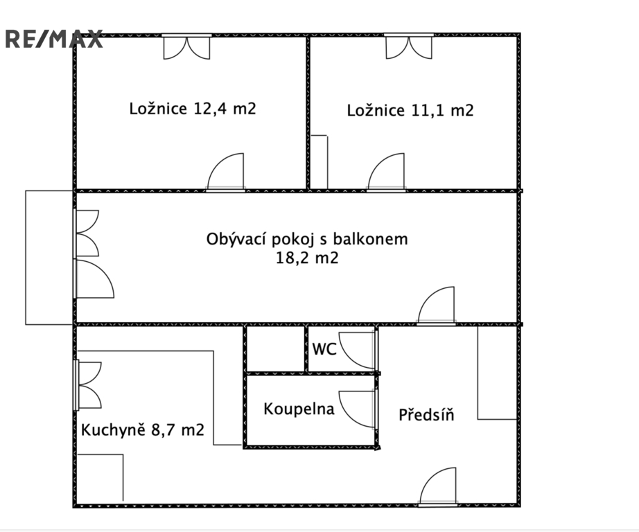 - obývací pokoj (18,2 m²) s balkonem je průchozí do obou ložnic