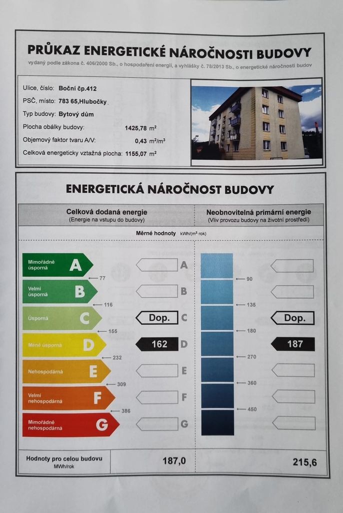 - Ukazatel energetické náročnosti budovy: 162 kWh/m²