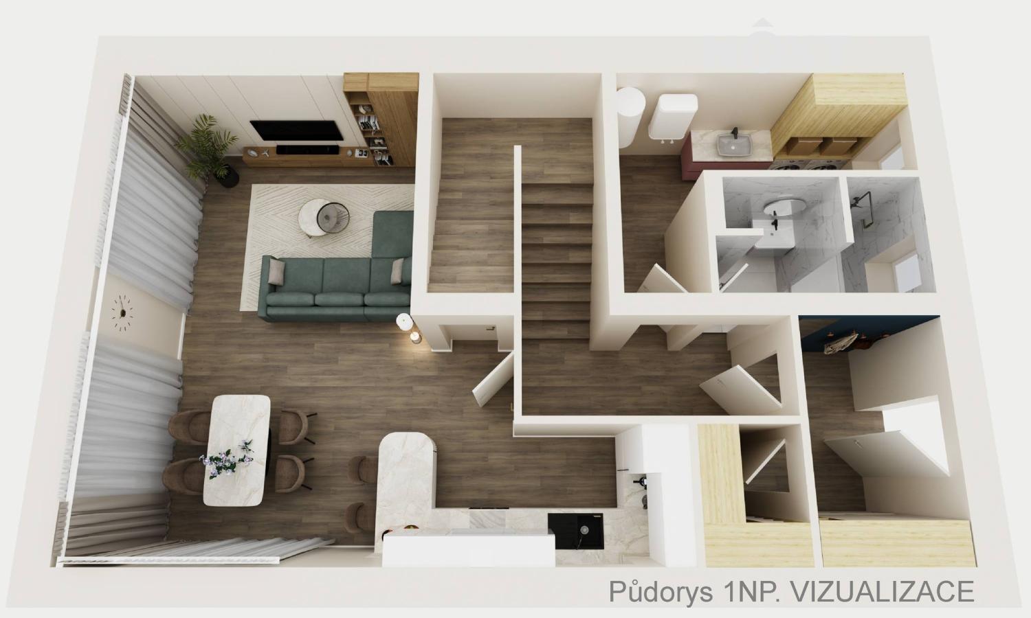 V přízemí se nachází vstupní zádveří (5,74 m²), šatna (2,21 m²) a chodba (4,55 m²). Dále koupelna (4,54 m²), technická místnost (8,16 m²), kuchyně (7,79 m²) a dominantní obytný prostor (27,93 m²) s přímým vstupem na terasu a do zahrady.