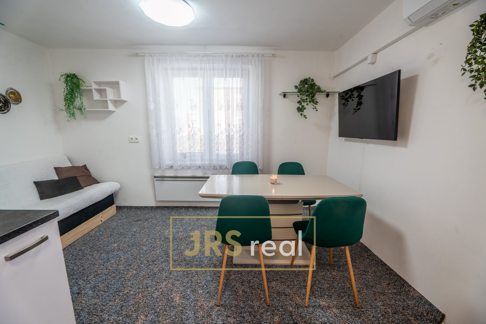 Na konci chodby vpravo se nachází kuchyně s jídelním koutem, která je vybavena novou kuchyňskou linkou, sporákem, jídelním stolem se židlemi, sedací soupravou, televizí a klimatizací. Ideální místo nejen pro vaření, ale i pro každodenní posezení.