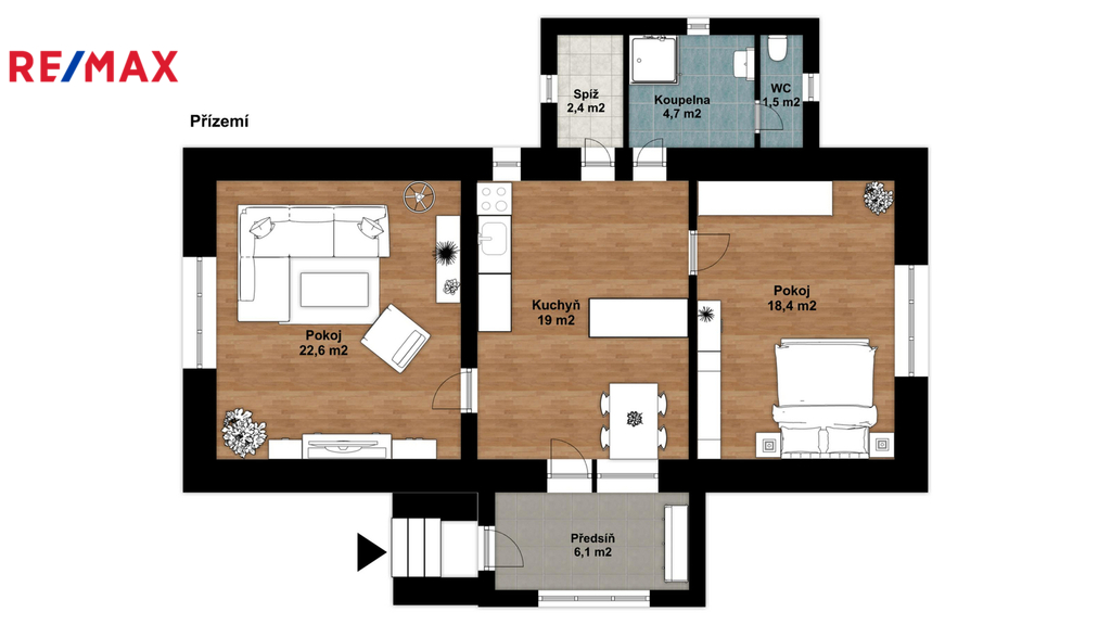 V domě o dispozici 2+1 najdete světlý obývací pokoj, kuchyň s jídelním koutem, ložnici s výhledem do zahrady, koupelnu s WC, spíž a předsíň. Přiložené 2D a 3D půdorysy Vám pomohou lépe si představit potenciál domu. Součástí domu je půda, která nabízí možnost rozšíření obytné části.