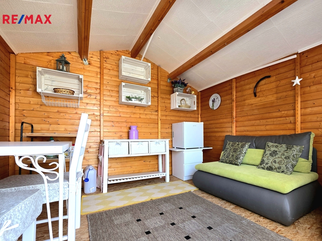 Dále v zahradě najdete zpevněnou plochu, kde můžete mít nadzemní bazén. Další součástí je stylový zahradní domek v provensálském stylu, který láká k romantickému posezení na vyvýšené terase s výhledy do okolí. Je vhodný i na letní pobyt/přespání. Rozsáhlý a členitý pozemek poskytuje nejen dostatek soukromí, ale také volnost k seberealizaci. Nabízí prostor pro zahradničení, chov, relaxaci, nebo i rozvoj podnikatelských záměrů – záleží jen na vaší fantazii. Pokud by pro Vás byl pozemek příliš veliký, lze část oddělit a prodat, neboť má možnost samostatného vstupu/vjezdu. Dle ÚP je pozemek zahrnut do ploch bydlení venkovské.