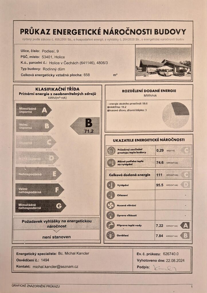 - Ukazatel energetické náročnosti budovy: 71 kWh/m²