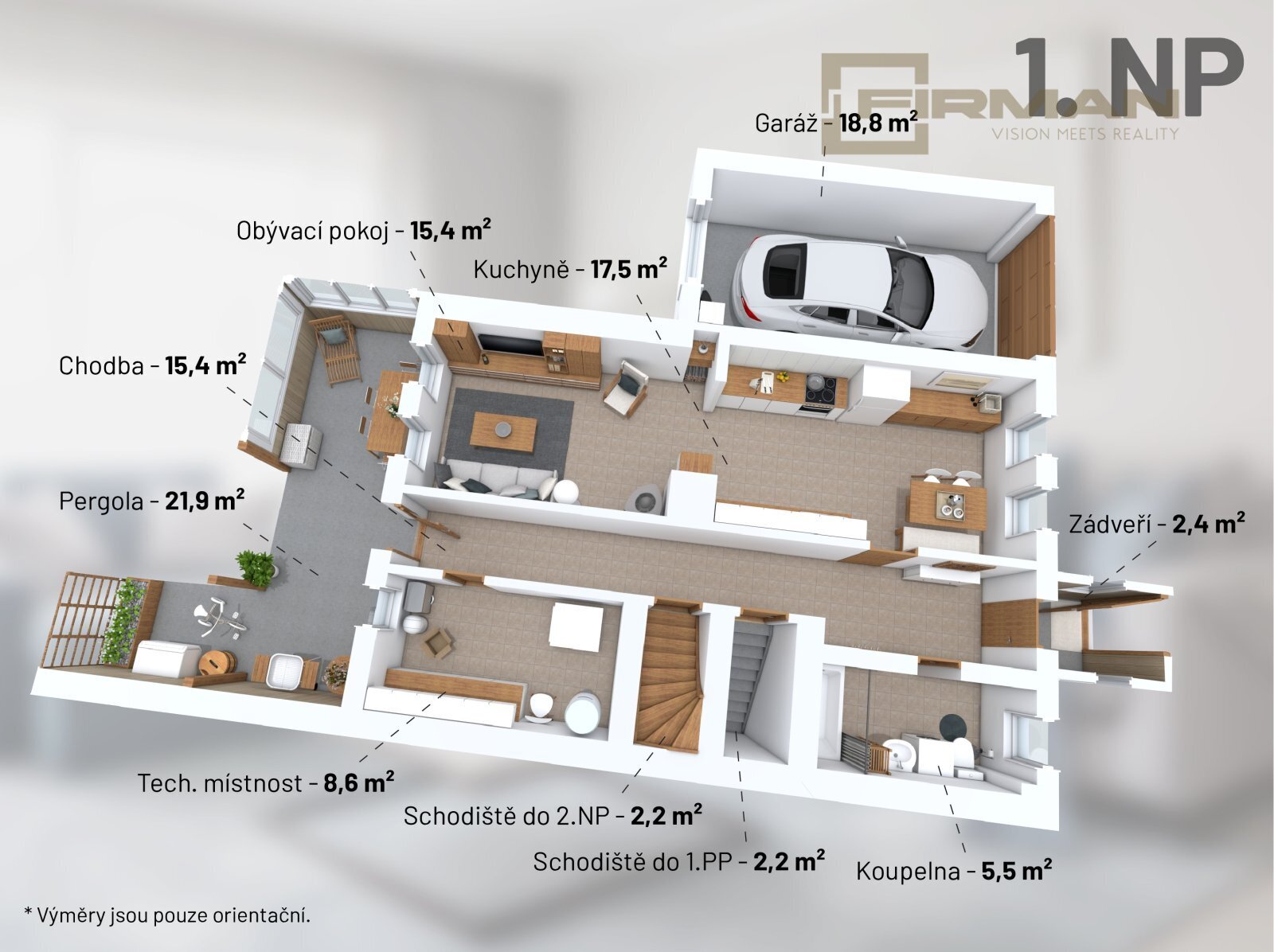 Rozložení uvedené plochy: Přízemí 66,8m² + 2,4m² zádveří + 18,8m² garáž, patro 64,8m², půda 64,8m² ,sklep 12m².