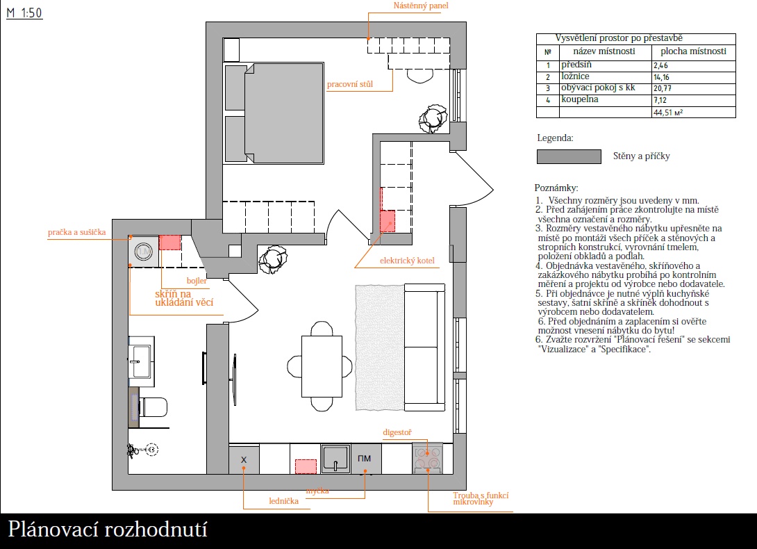 Dispozice: byt se skládá ze vstupní chodby 2,46 m², ložnice 14,16 m², obývacího pokoje s kuchyní 20,77 m² a koupelny 7,12 m². Nemovitost bude předaná ve stavu, jak na fotodokumentaci.