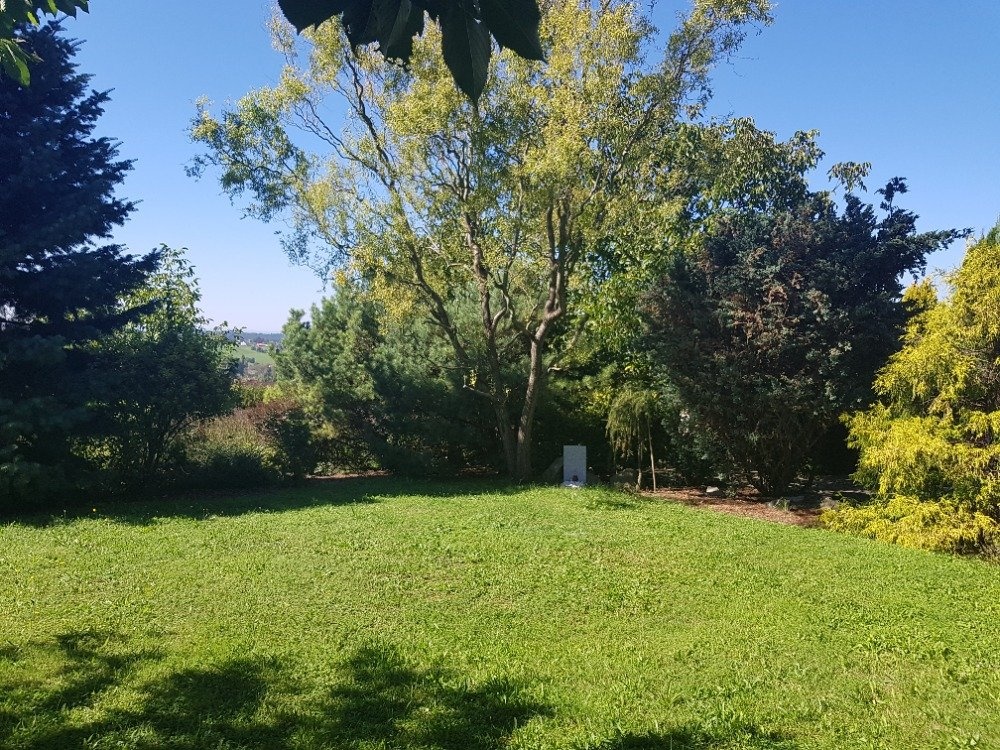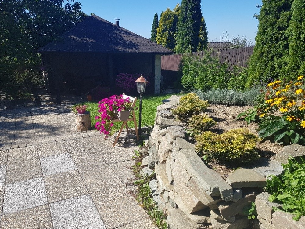 Na zahradě se nachází ovocné a okrasné stromy a keře, různého druhu a stáří a také pergola s krbem.