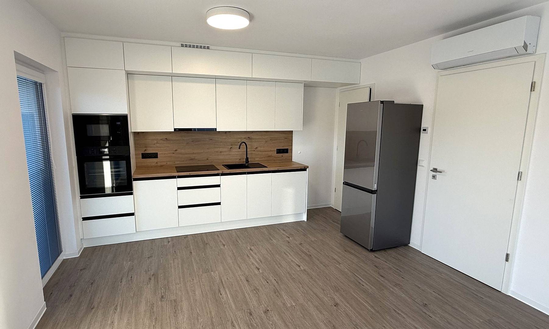 Byt je pronajímán jako nezařízený, k dispozici je však plně vybavená kuchyňská linka se spotřebiči: vest. indukční varná deska, vest. elektrická trouba, digestoř, vest. mikrovlnná trouba, vest. myčka nádobí a lednice s mrazákem. Součástí bytu je také vestavěná šatní skříň v chodbě, samostatná šatna přístupná z ložnice a spíž.