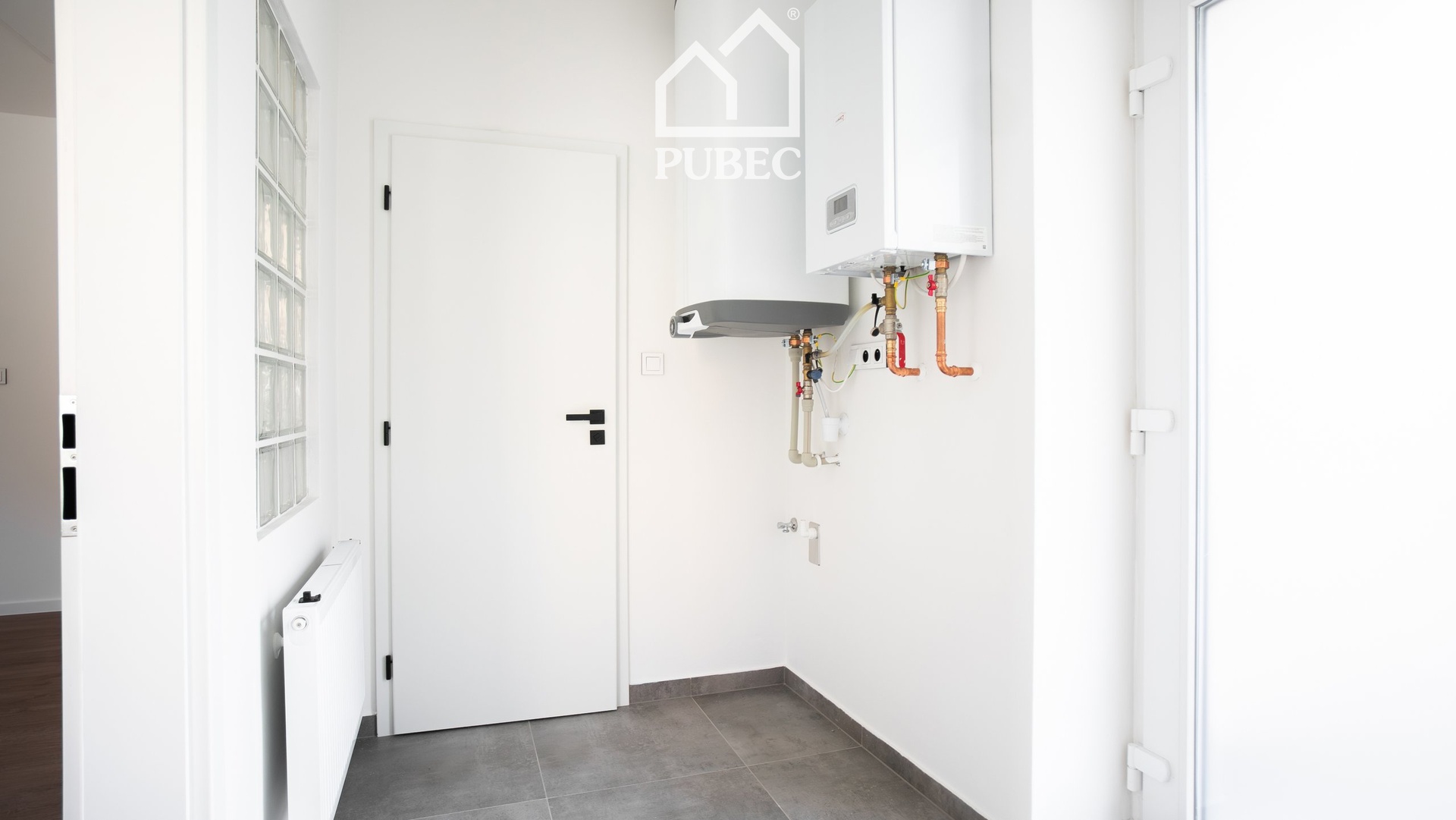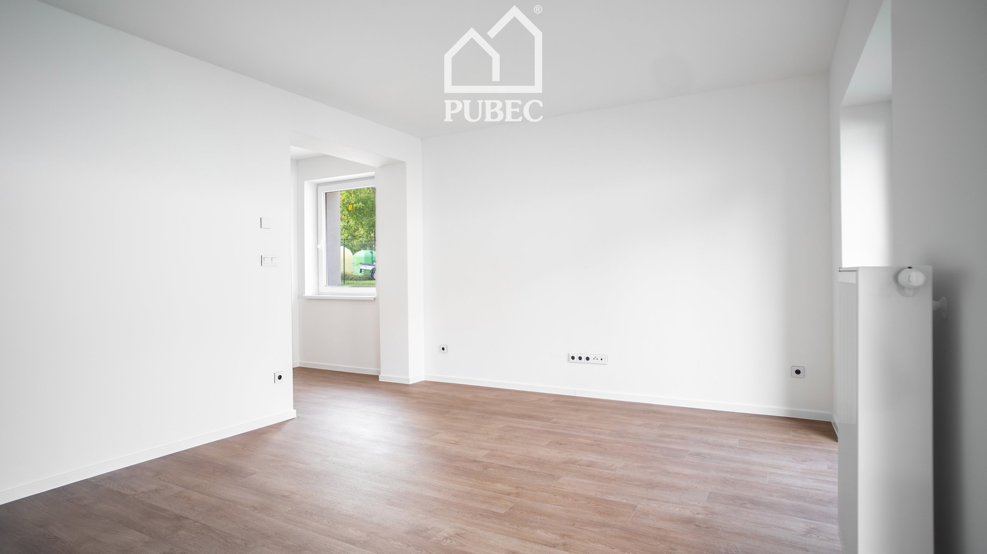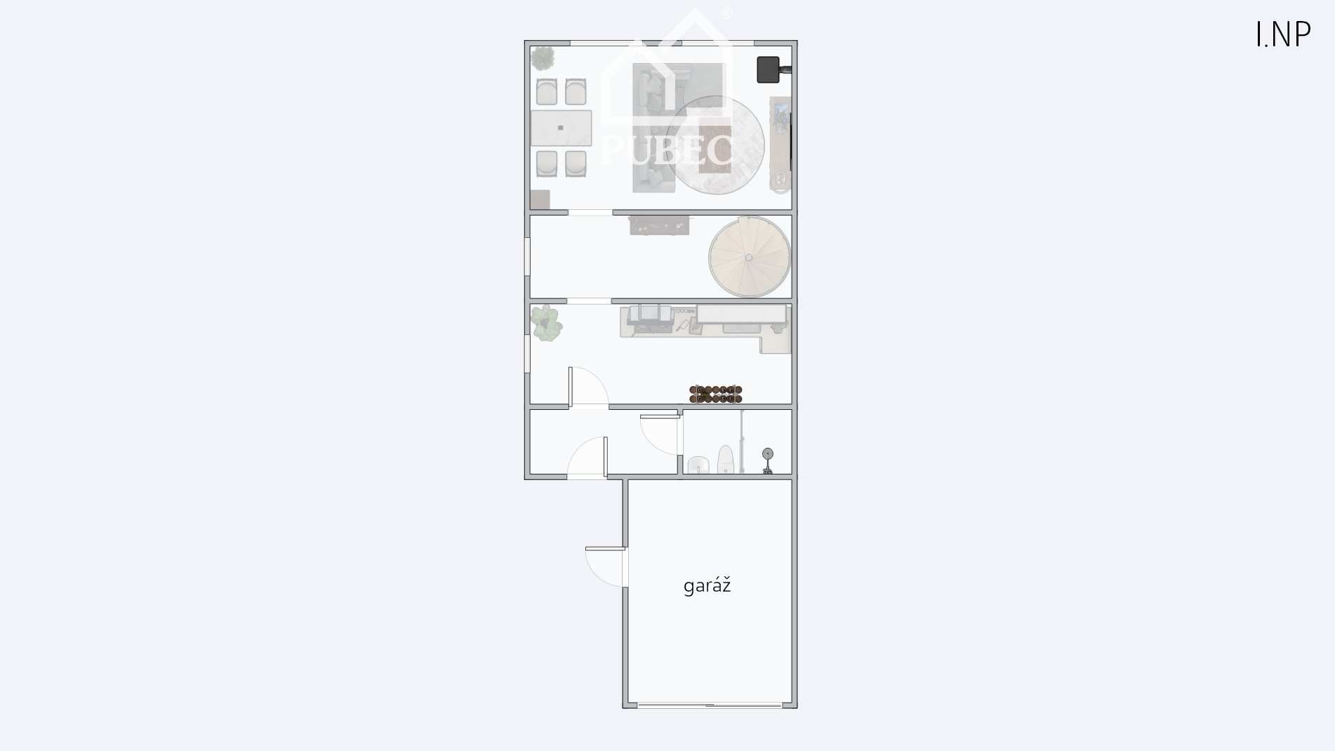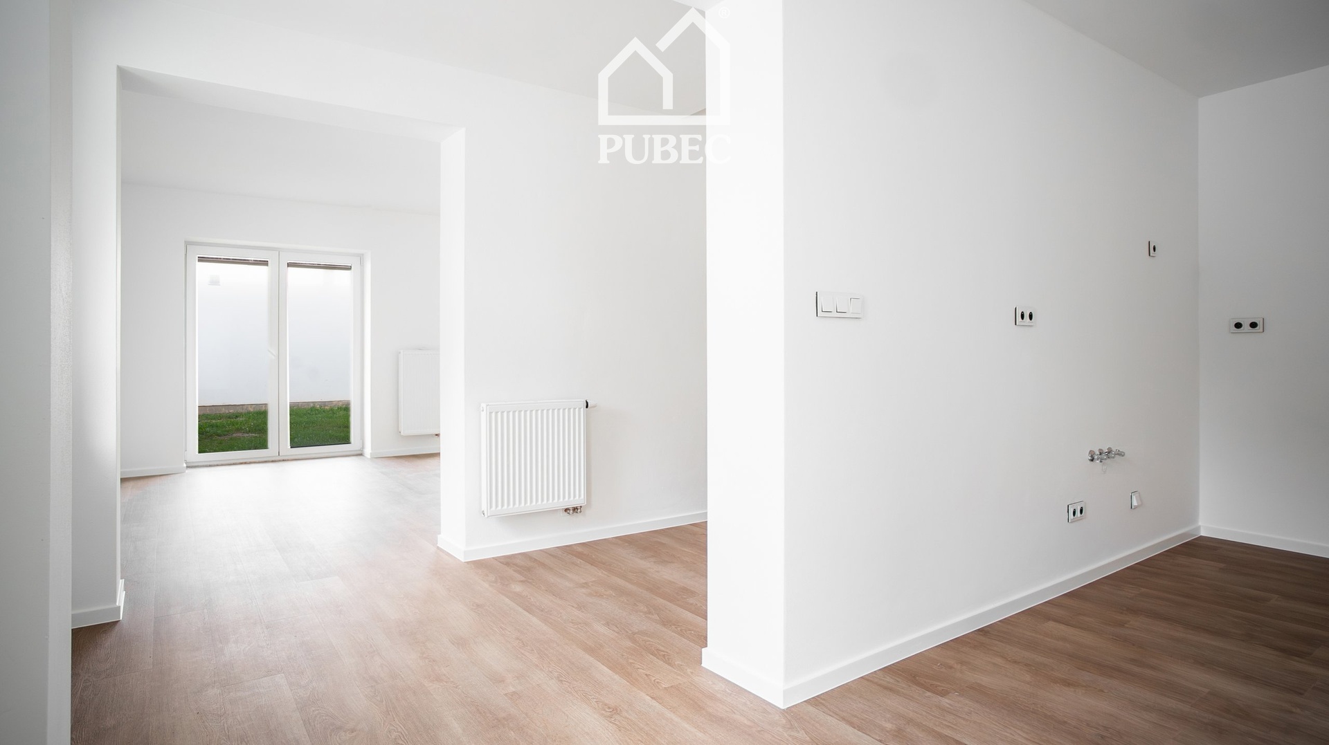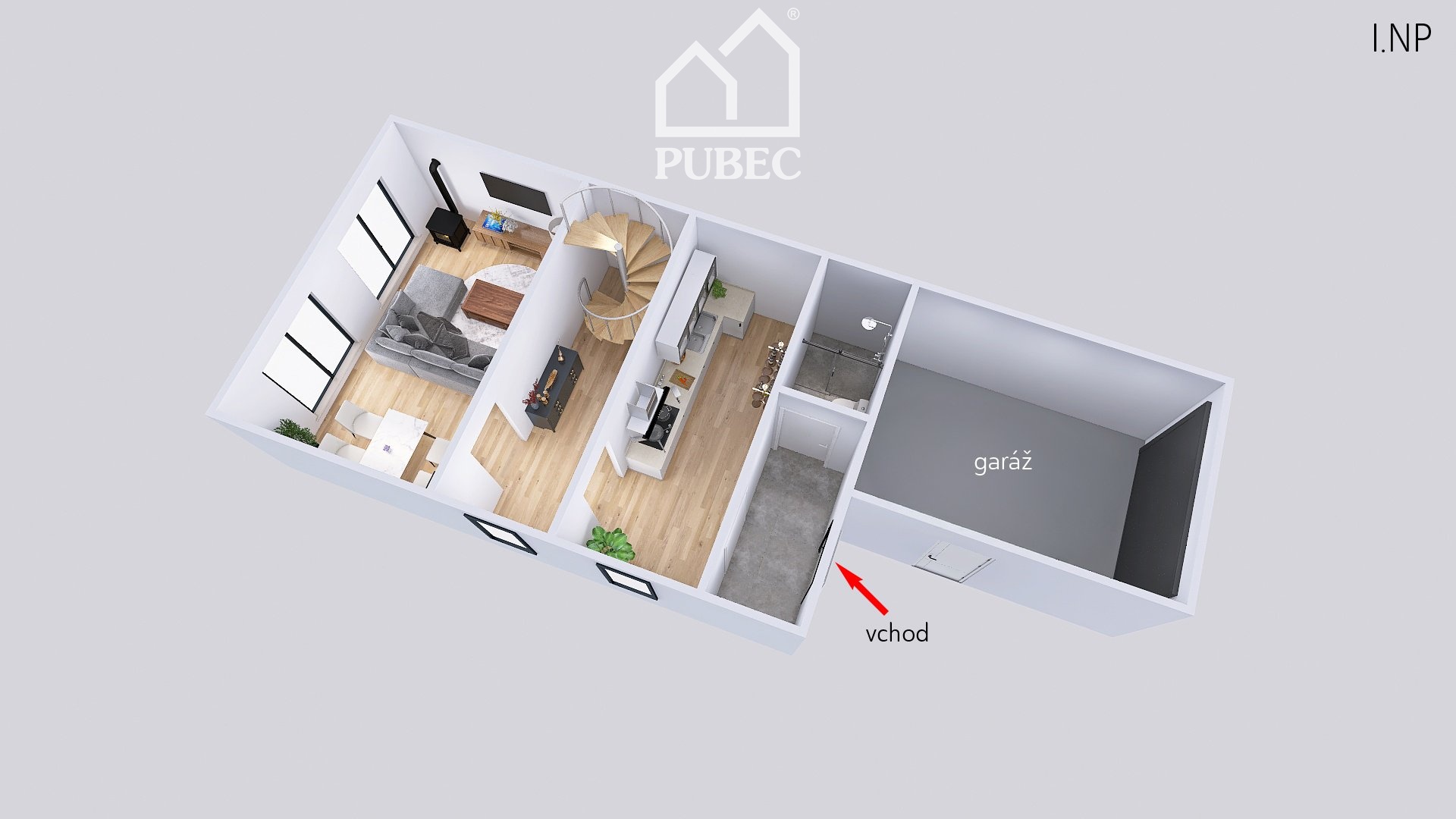 Přízemí: vstupní část, koupelna se sprchou a WC, moderní kuchyně se spotřebiči, světlý obývací pokoj se vstupem na zahradu a vytápěná garáž.
