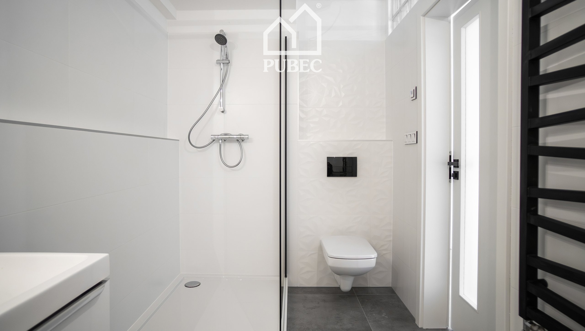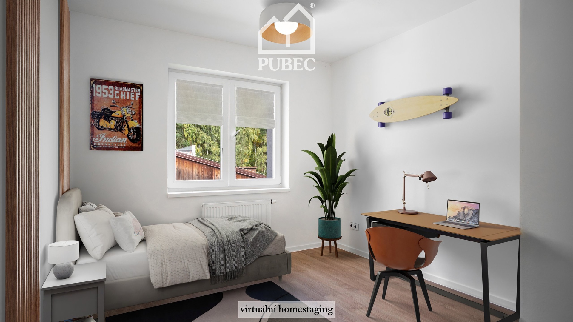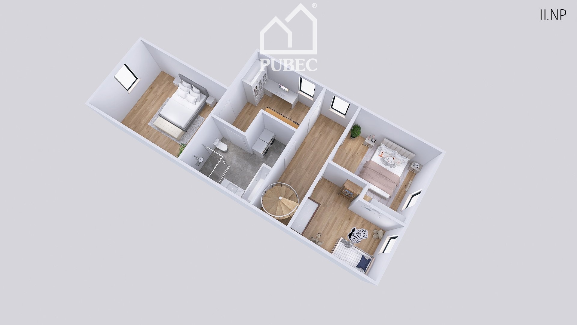 Patro: tři ložnice, pracovna a elegantní koupelna s podlahovým topením, vanou a WC.