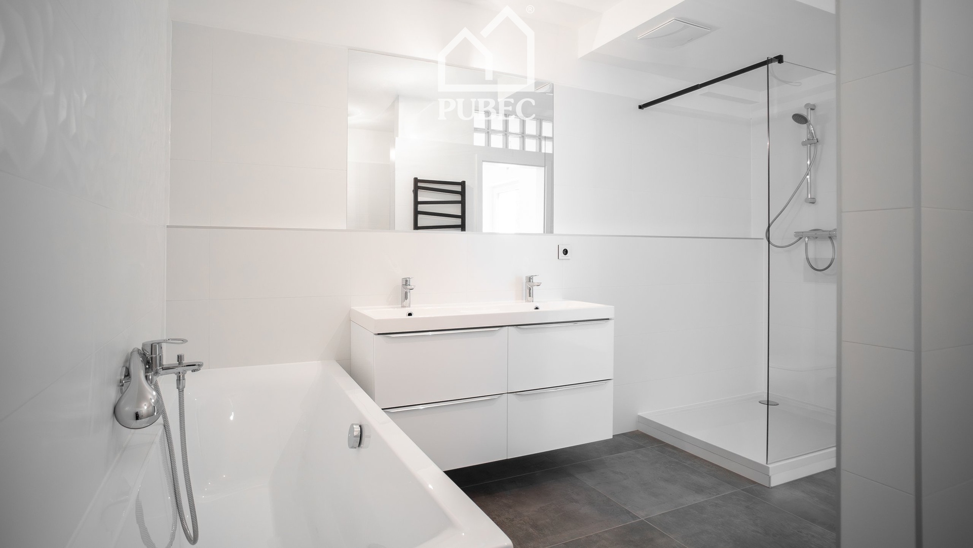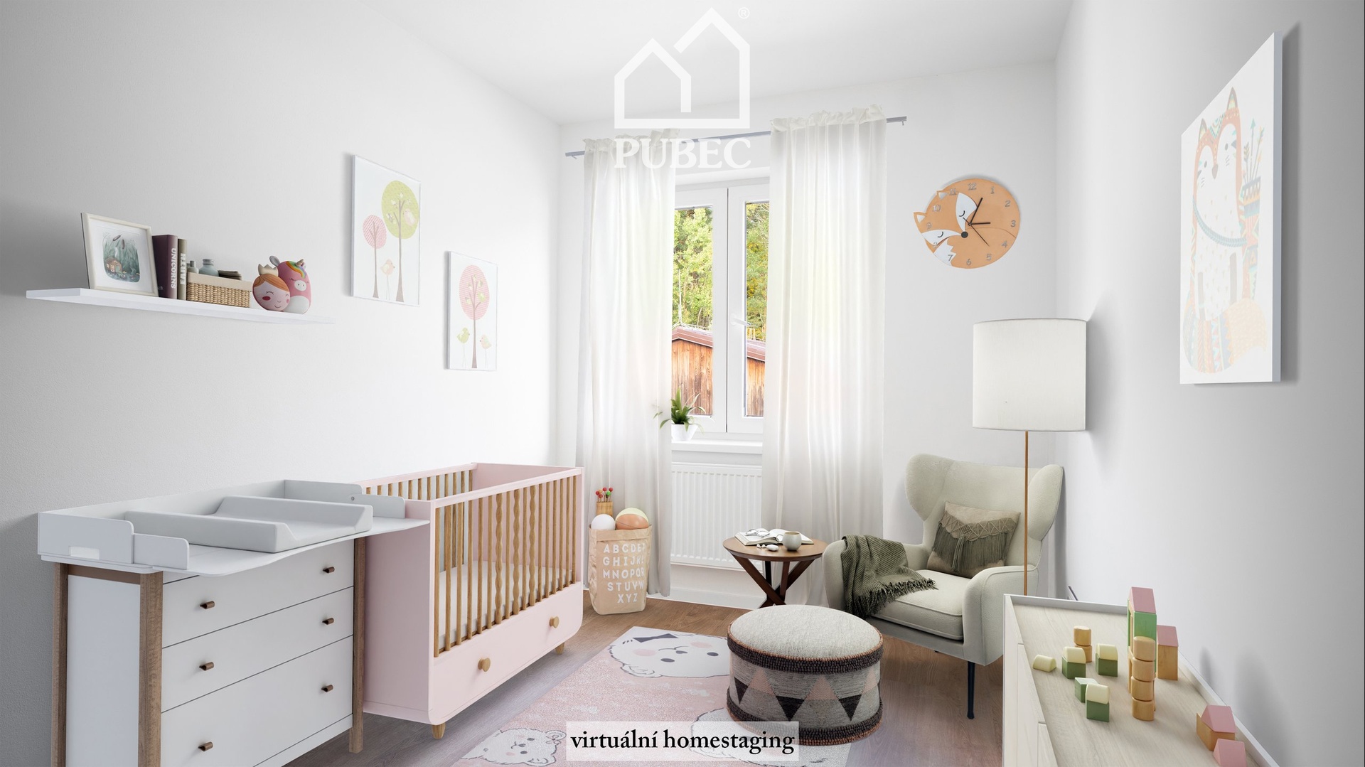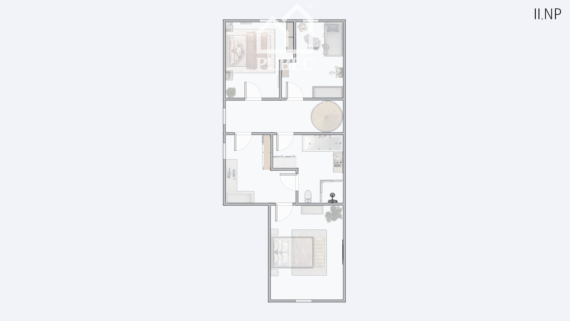 Patro: tři ložnice, pracovna a elegantní koupelna s podlahovým topením, vanou a WC.
