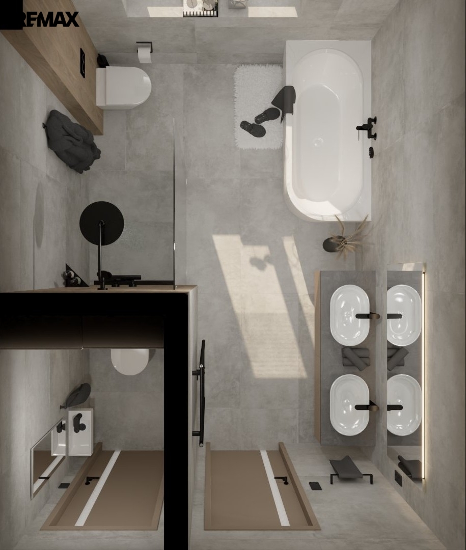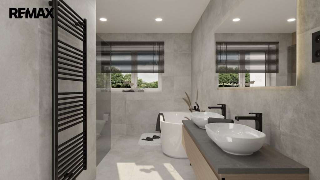 - Koupelna a 2x wc včetně sanity, obkladů a dlažby dle vizualizace