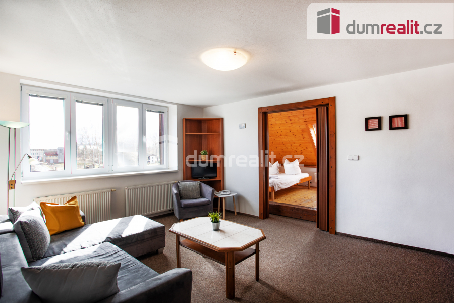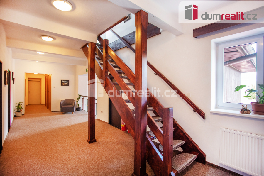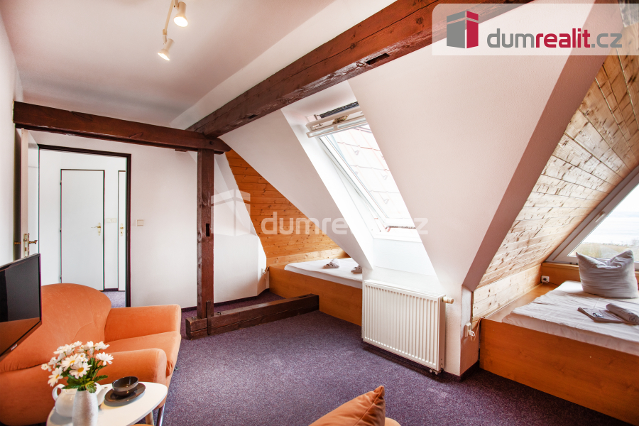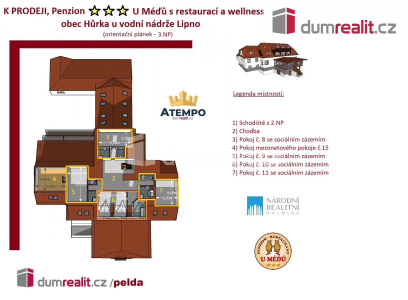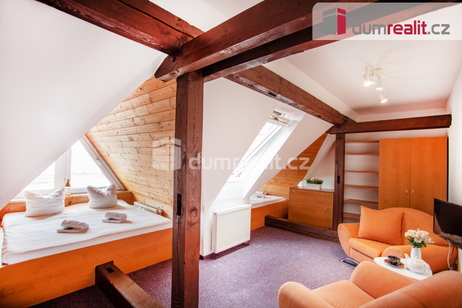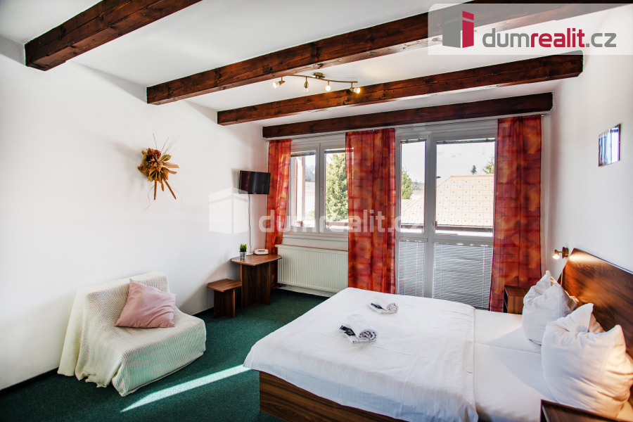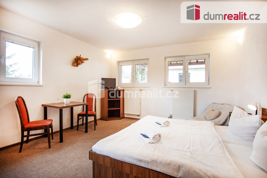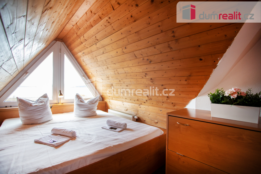 Fungující penzion je částečně podsklepený a je vystaven do 2 nadzemních podlaží s obytným podkrovím. Podrobné rozkreslení dispozice naleznete na orientačním plánku mezi fotografiemi. Z většiny pokojů je výhled na vodní nádrž Lipno.