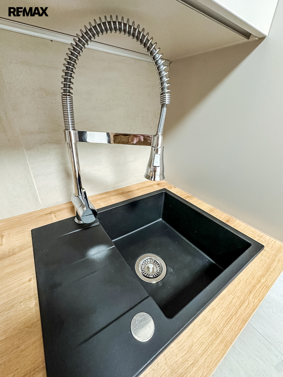 Dispozice bytu je prakticky členěná. Vstupními dveřmi vejdete přímo do hlavního prostoru s kuchyňským koutem, který nabízí dostatek místa pro jídelní stůl. Po pravé straně se nachází obývací pokoj, kterému dominuje francouzské okno zajišťující dostatek denního světla. V levé části bytu se nachází moderně řešená koupelna. Ta je vybavena luxusní hlavovou sprchou Grohe Rainshower s přídavnou masážní tryskou. Ohřev vody zajišťuje chytrý bojler s funkcí samoučení, který optimalizuje spotřebu podle vašich potřeb. Vedle koupelny je vstup do ložnice, ze které je přístup na balkón orientovaný do klidné zahrady. Celý interiér působí velmi světlým a vzdušným dojmem.