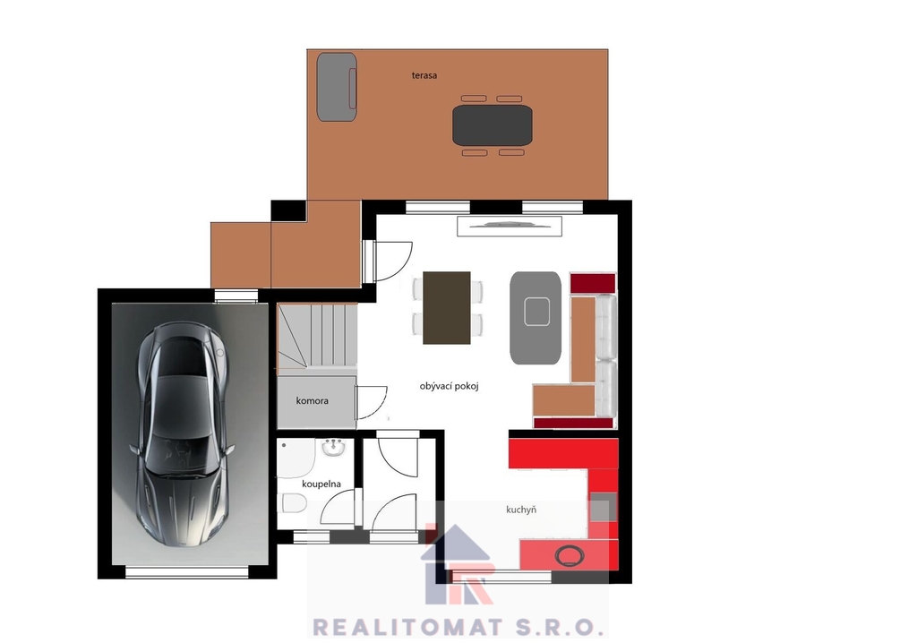 Součástí obývacího pokoje je elegantní betonové jednoramenné točité schodiště vedoucí do 2. NP. Pod schodištěm se nachází praktická spižírna.
