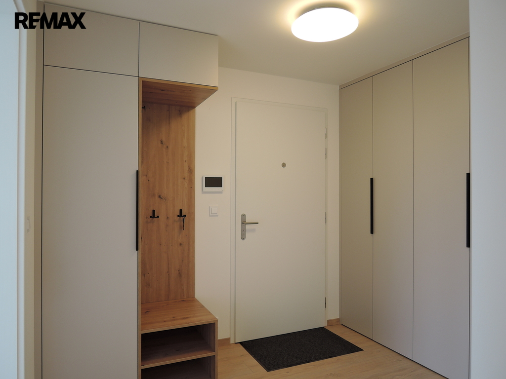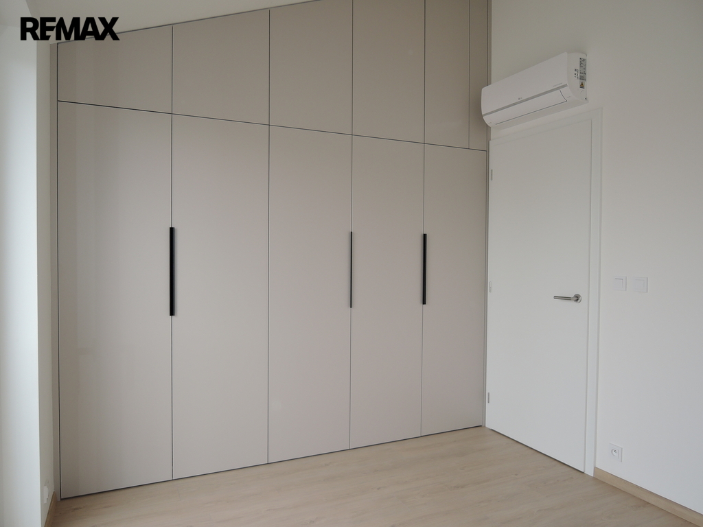 Byt je umístěn ve 4. NP ze čtyř a skládá se z obývacího pokoje s kuch. koutem (23 m2) - první balkon (3 m2), ložnice (12 m2), pokoje (8 m2) - druhý balkon (3 m2), koupelny s vanou (5 m2), odděleného WC (2 m2) a předsíně (13 m2). Byt je vybaven novou kuchyňskou linkou na míru s vestavnými spotřebiči BOSCH (myčka, trouba s funkcí páry, sklokeramická varná deska, digestoř, lednice, mrazák). V ložnici a předsíni jsou prostorné vestavné skříně a úložné prostory. Bytová jednotka je dále vybavena klimatizací, podlahovým topením a předokenními roletami na elektrický pohon. PENB je B.