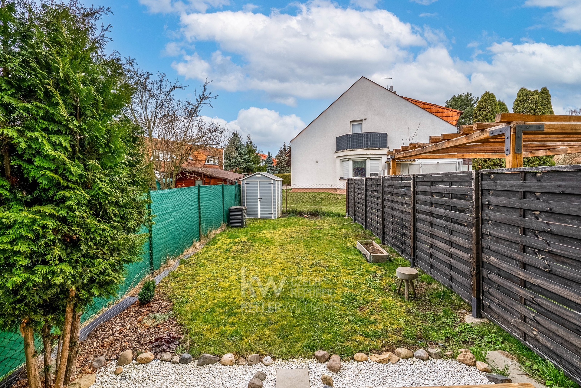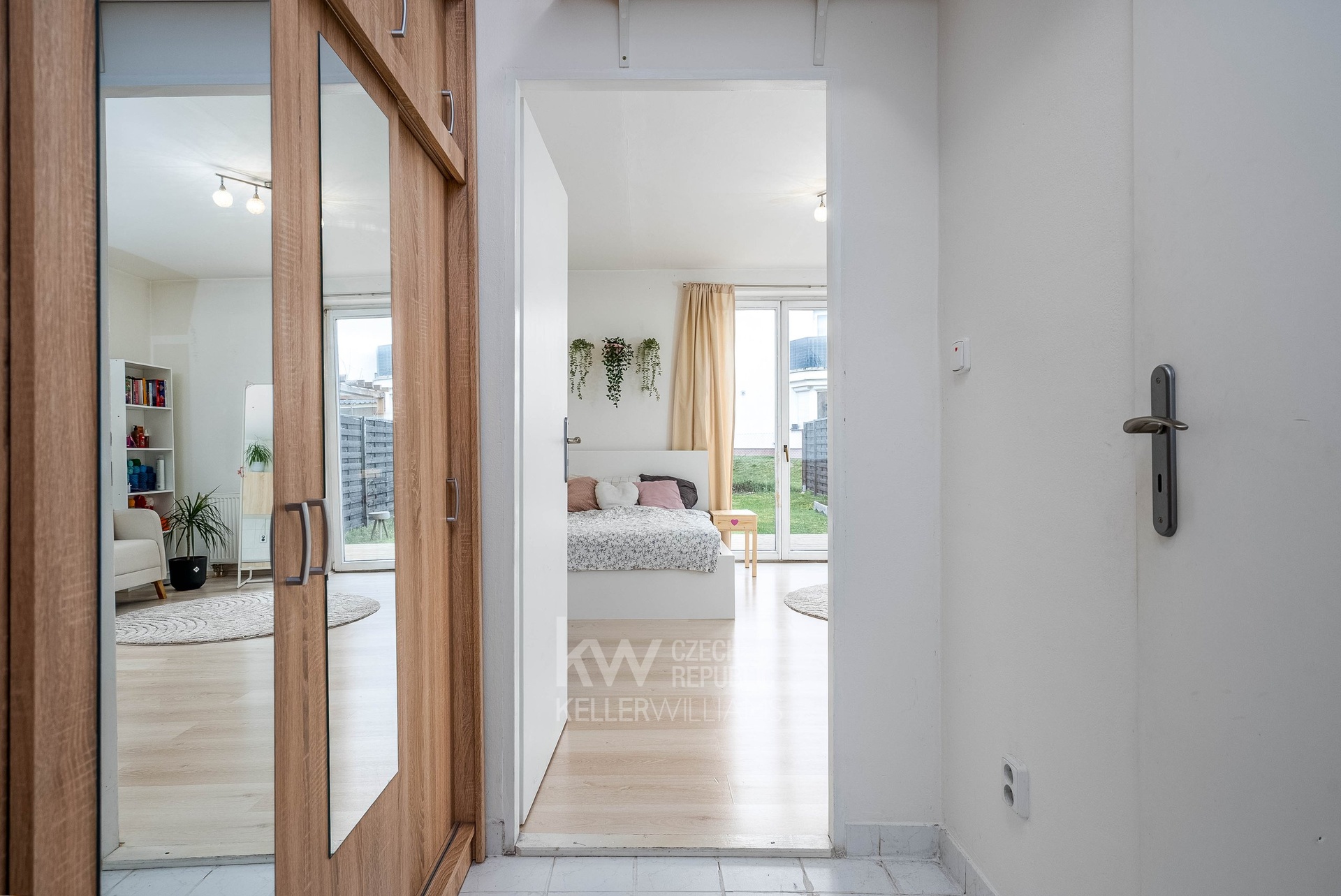 Dominantou bytu je obytný prostor s kuchyňským koutem a přímým vstupem na vlastní zahradu, orientovanou na západní stranu. Právě venkovní prostor dodává bytu příjemný rozměr navíc – ať už pro posezení po práci, ranní kávu, pěstování bylinek nebo jednoduché každodenní užívání bez kompromisů.