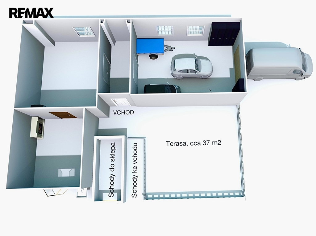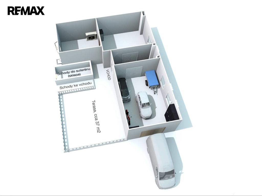 Vjezd do garáže z dílnou je z volné štítové strany. Plocha je 35 m2 a lze parkovat až 4 auta.