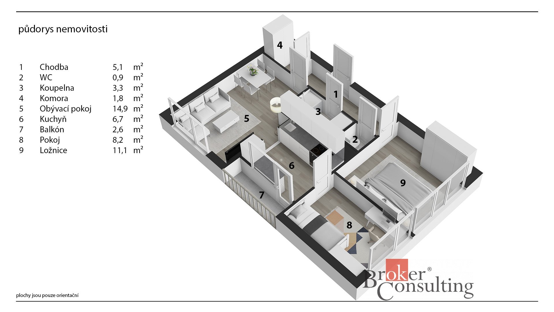 - Celková podlahová plocha: 55 m²