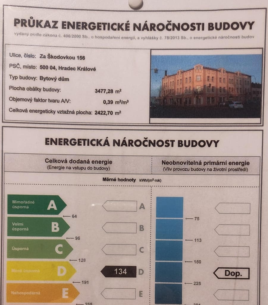 - Ukazatel energetické náročnosti budovy: 134 kWh/m²