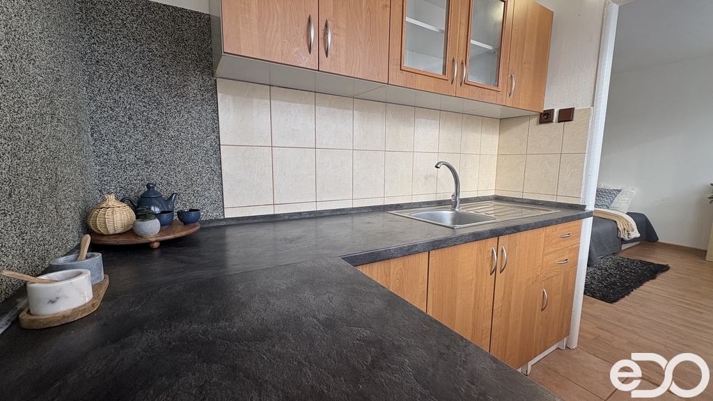 Dispozice bytu nabízí obytný pokoj, samostatnou kuchyni s kuchyňskou linkou a koupelnu se sprchovým koutem. Byt nemá balkon, ale díky umístění ve vyšším patře je příjemně světlý. Součástí bytu je také sklepní kóje, která poskytuje praktický úložný prostor.