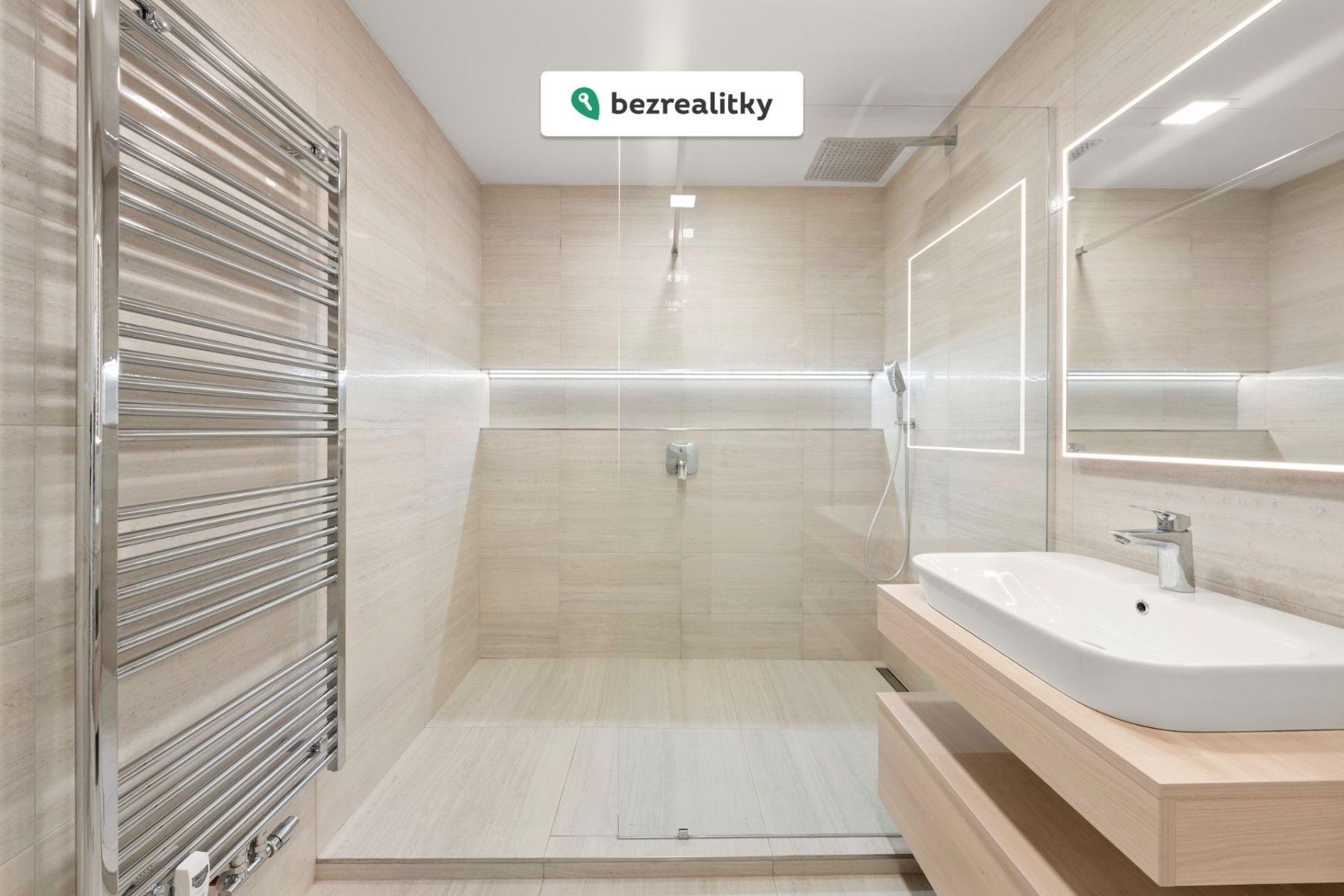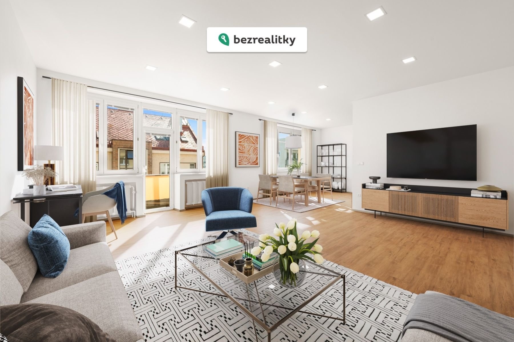 Prostorný obývací pokoj s kuchyňským koutem je orientován na jih a nabízí přímý vstup na balkon s výhledem na historické centrum města. Obývací pokoj disponuje velkými okny a tím má hlavní část bytu dostatek světla. Dvě ložnice jsou orientovány do tichého vnitrobloku, což zajišťuje klid a soukromí. Koupelna je vybavena prostorným sprchovým koutem, tropickým deštěm, podsvícenou nikou a je obložena travertinovým obkladem. Toaleta je samostatná s umyvadlem s podsvícením. Byt prošel kompletní rekonstrukcí - byly instalovány nové plovoucí podlahy, designové dveře Sapeli, byla provedena nová elektroinstalace s revizní zprávou a výměna vodovodních rozvodů. Vše bylo provedeno renomovanou stavební firmou.
