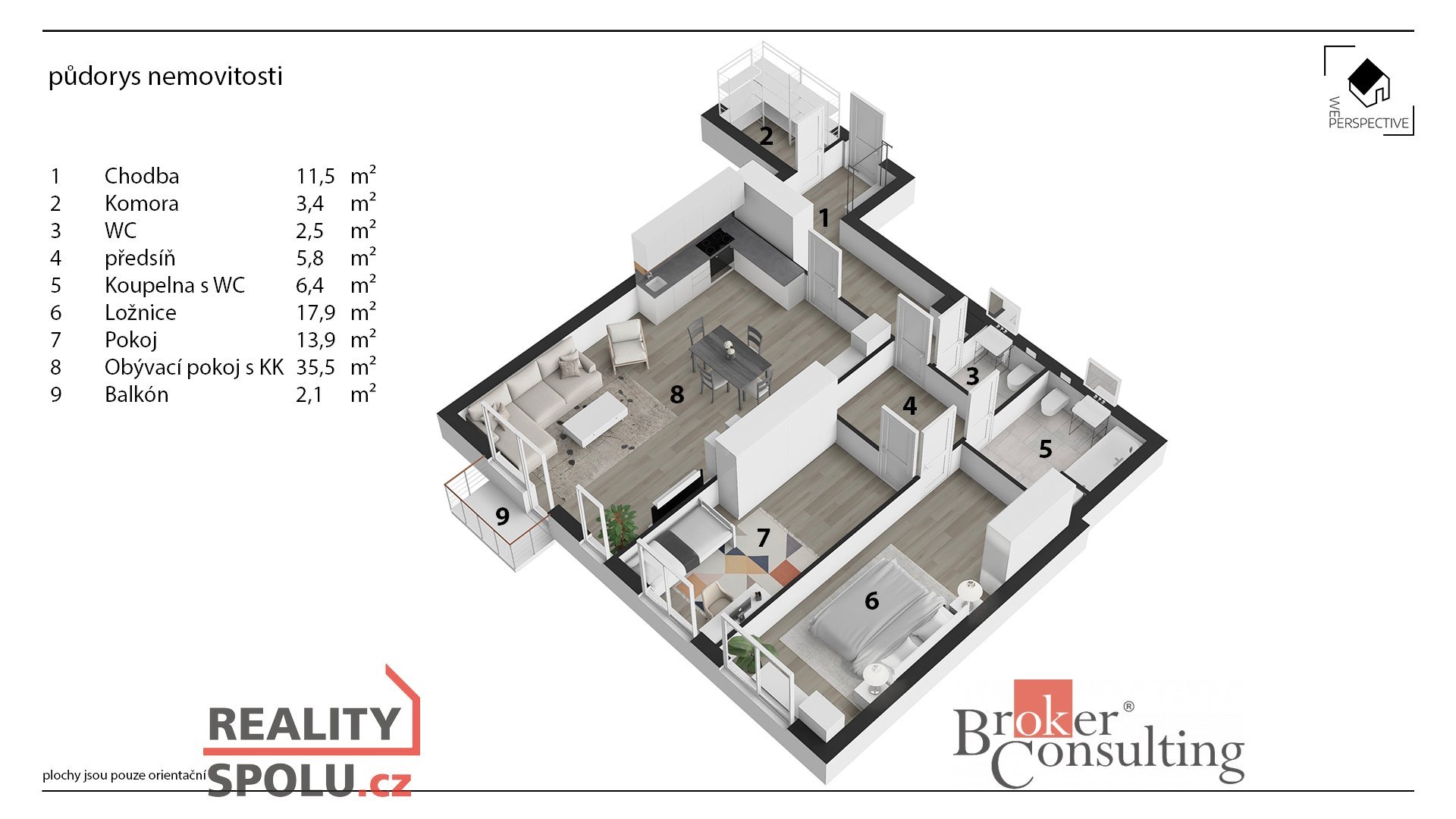 Byt o celkové výměře 107 m² nabízí komfortní dispozici: hlavní obytný prostor propojuje kuchyňský kout, jídelnu a obývací část, ze které je vstup na balkon. Dále jsou zde dvě samostatné místnosti – ložnice a pokoj, koupelna s toaletou, samostatné WC, úklidová komora a prostorná vstupní chodba.
