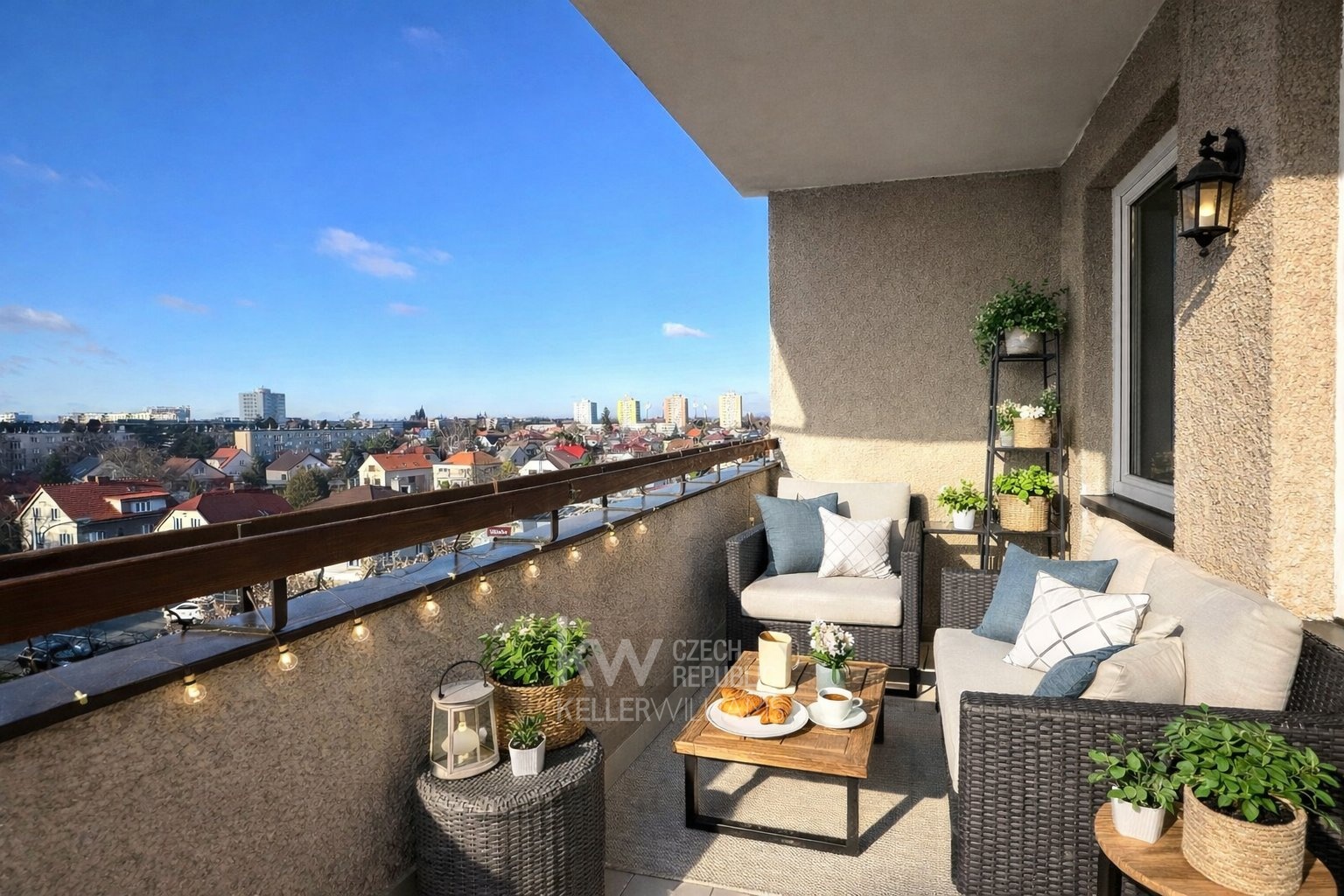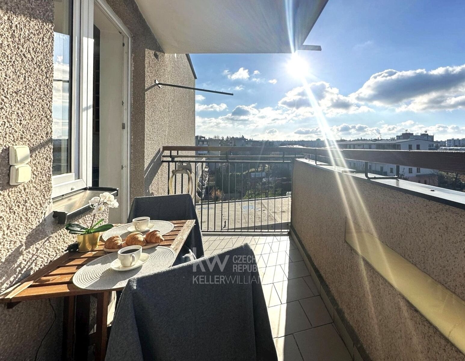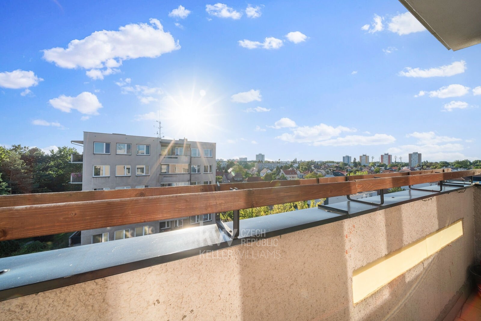 Jedním z největších benefitů bytu je prostorný balkon s dlažbou, který nabízí dostatek místa pro venkovní posezení. Odtud se naskýtá velmi hezký výhled na panorama Hradce Králové.