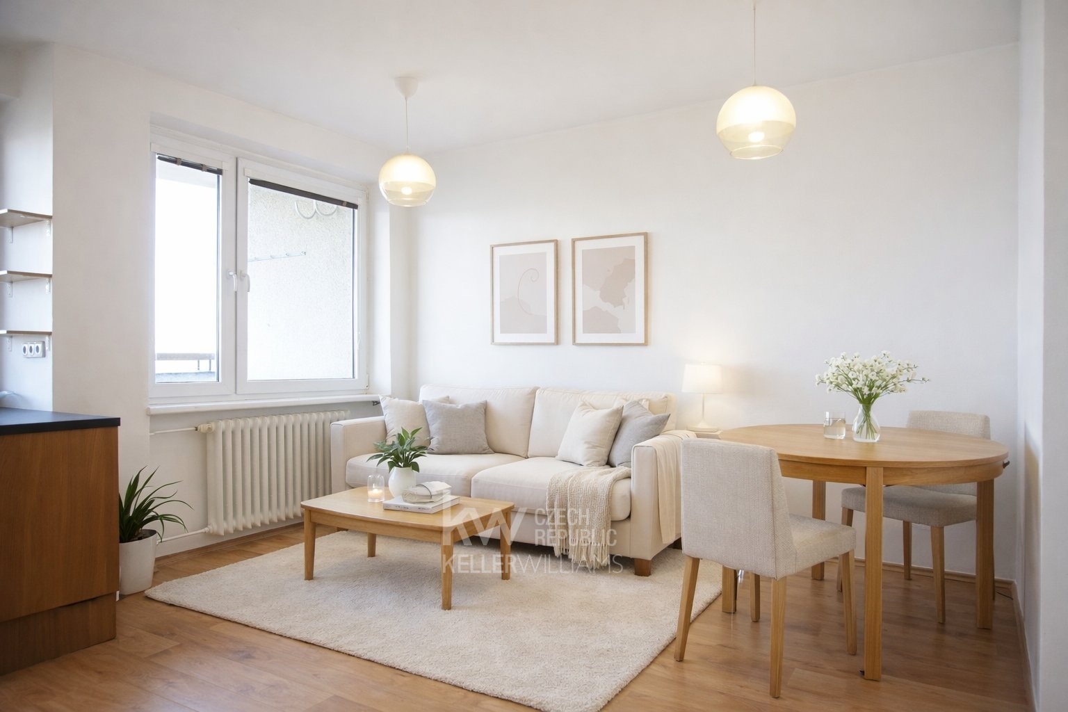 Obývací pokoj s přímým vstupem na balkon, nabízející dostatek prostoru pro relaxaci i společenské setkávání. Na obývací pokoj navazuje kuchyňský kout s moderní linkou s dvířky ze světlého dubového masivu, vybavenou vestavěnými spotřebiči včetně sporáku, myčky a lednice. Promyšlené uspořádání a dostatek úložných prostor zajišťují maximální praktičnost.