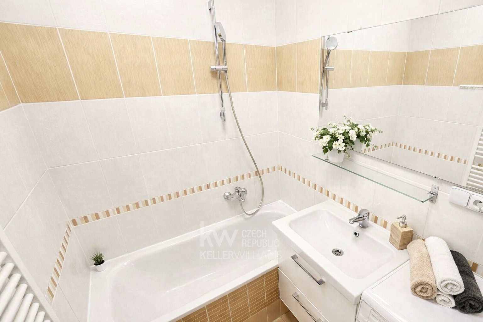 Koupelna: Koupelna je vkusně obložena světlými obklady s teplými tóny a vybavena moderní sanitou. Najdete zde vanu s integrovanou sprchou, umyvadlo se skříňkou pro úložný prostor a pračku. Toaleta je oddělena.