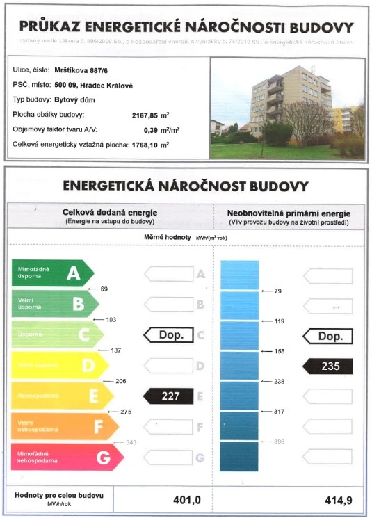 - Ukazatel energetické náročnosti budovy: 401 kWh/m²