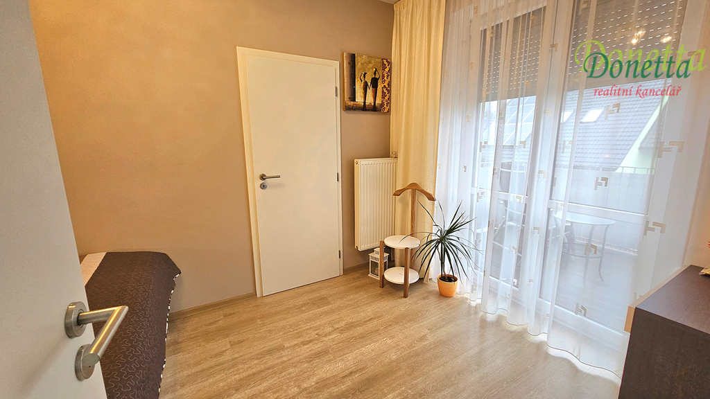 Dispozice: vstupní chodba s úložnou šatní skříní, koupelna s rohovou vanou, umyvadlem, prostorem pro pračku, žebříkovým radiátorem a toaletou se závěsným WC, obývací pokoj s kuchyňským koutem a jídelní částí, ložnice s balkonem, úložná komora/šatna, která je využívána jako pracovna a sklep v přízemí domu. Podlahová krytina v chodbě a koupelně je dlažba, pokoje mají laminátovou plovoucí podlahu.