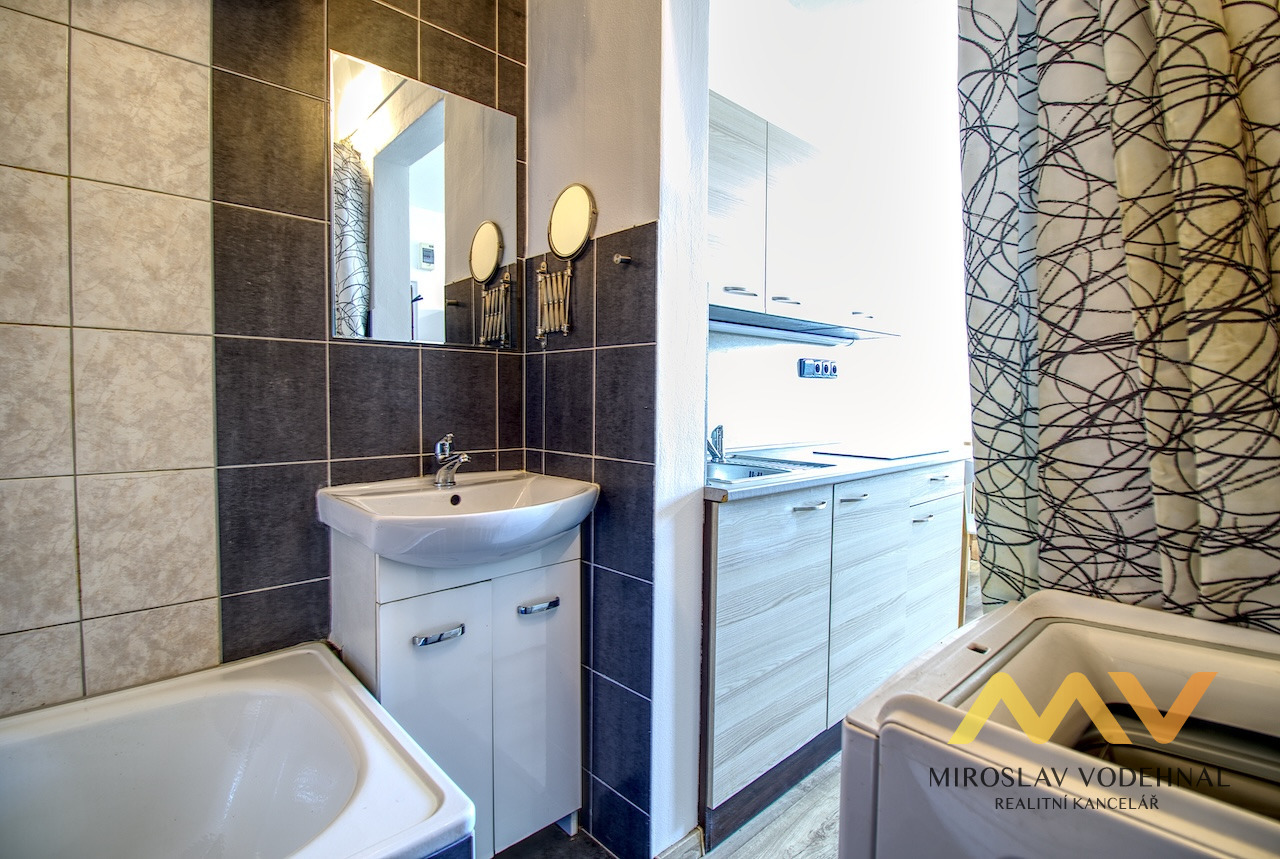 Byt je světlý a útulný, dispozičně řešený jako obývací pokoj s kuchyňským koutem, koupelna s WC a lodžie. Kuchyňská linka je nová a vybavená novými spotřebiči (malá lednice, sklokeramická varná deska, mikrovlnná trouba), byt je navíc kompletně zařízený – k dispozici je postel, jídelní stůl se židlemi i úložné skříně, smart TV. Koupelna se zděným jádrem je modernizovaná a nabízí vanu, umyvadlo se skříňkou, toaletu a pračku. Podlahy tvoří PVC a dlažba, plastová okna mají žaluzie. Sklep není k dispozici. Nově vymalováno. Optický internet zaveden (není součásti ceny nájmu).