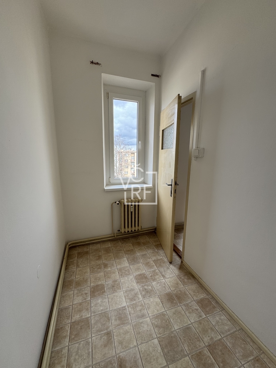 vstupní hala s komorou, dva samostatné, průchozí pokoje se vstupem na lodžii, dále samostatné WC, koupelna s vanou a obytná kuchyň s balkonem a dvě komory. Byt je nezařízený, k dispozici je pouze kuchyňská linka s sporákem.