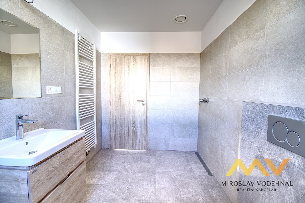 Dominantou domu je velkorysý obývací prostor s kuchyňským koutem o ploše 38 m², který přirozeně navazuje na prostornou terasu a zahradu, čímž vytváří harmonické propojení interiéru s exteriérem. Soukromou část tvoří ložnice o velikosti 21 m² a dva další pokoje (15 m² a 13,5 m²), které mohou sloužit jako dětské pokoje, pracovna či pokoj pro hosty. Praktickým benefitem je samostatná pracovna/šatna o ploše 8,5 m², dvě plnohodnotné koupelny s toaletou, technická místnost a vstupní zádveří.